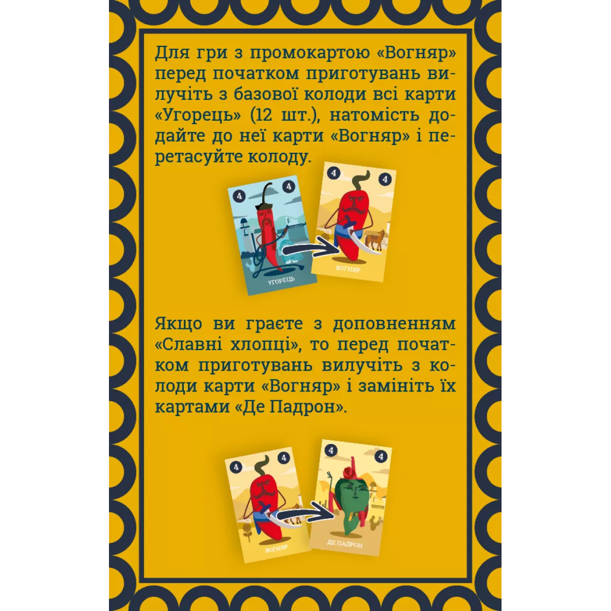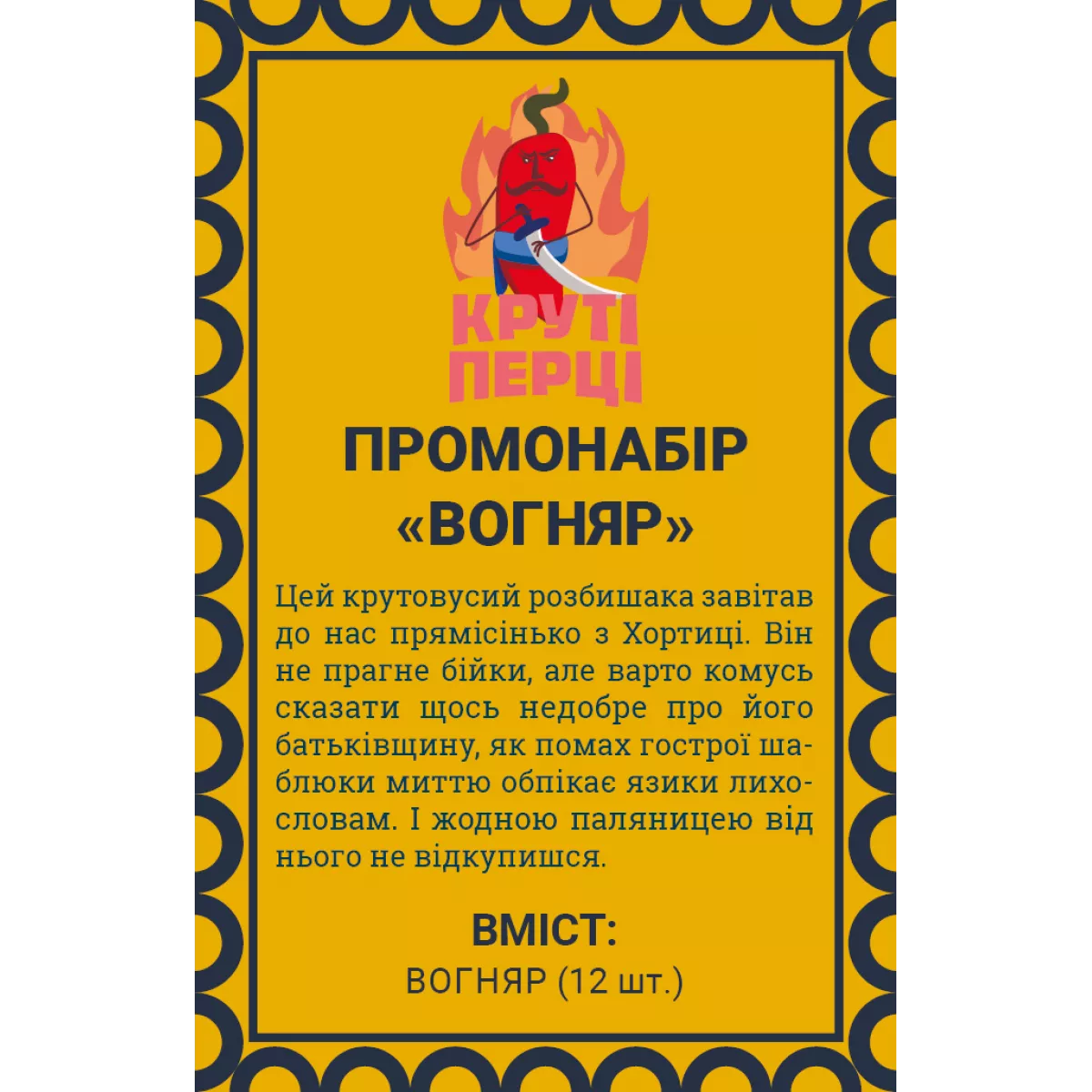 Увага! Для гри потрібна базова гра Круті Перці.   Круті Перці (Chili Mafia) - це гра на збирання наборів карт для 2–8 гравців, у якій гравці змагаються за те, хто збере найсильніші банди перців (набори карт) і стане наймогутнішим і найшанованішим босом мафії. Як зазвичай, переможе той, хто набере найбільше очок наприкінці гри. Промонабір Вогняр містить 12 карток. Цей крутовусий розбишака Вогняр завітав до нас прямісінько з Хортиці. Він не прагне бійки, але варто комусь сказати щось недобре про його батьківщину, як помах гострої шаблюки миттю обпікає язики лихословам. І жодною паляницею від нього не відкупишся. Зверніть увагу: для гри з промокартками «Вогняр» перед початком приготувань до партії необхідно вилучити з базової колоди всі карти «Угорець» (12 шт.), натомість додати до неї карти «Вогняр» і не забудьте добре пошафлити (перемішати) колоду. Якщо ж ви граєте з доповненням Славні хлопці, то перед початком приготувань вилучіть з колоди карти «Вогняр» і замініть їх картами «Де Падрон».