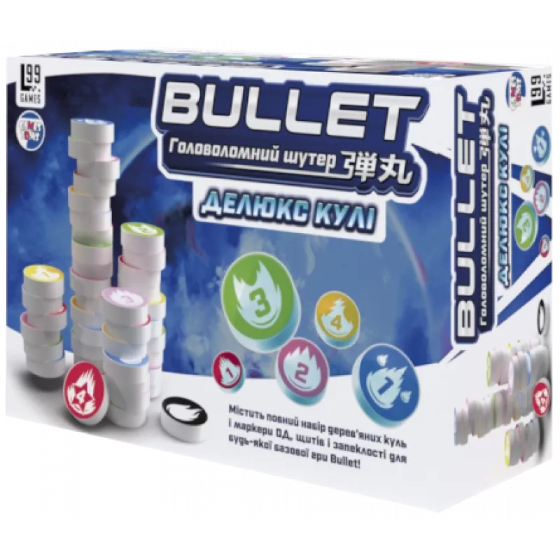 Делюкс кулі для гри «BULLET. Головоломний шутер»Повний набір дерев'яних куль і маркерів очок дій, щитів і запеклості для гри «BULLET. Головоломний шутер». Joy впевнено радить замовити цей набір задля косметичного покращення ігрового досвіду – дерев'яні компоненти круто виглядають і приємні на дотик...