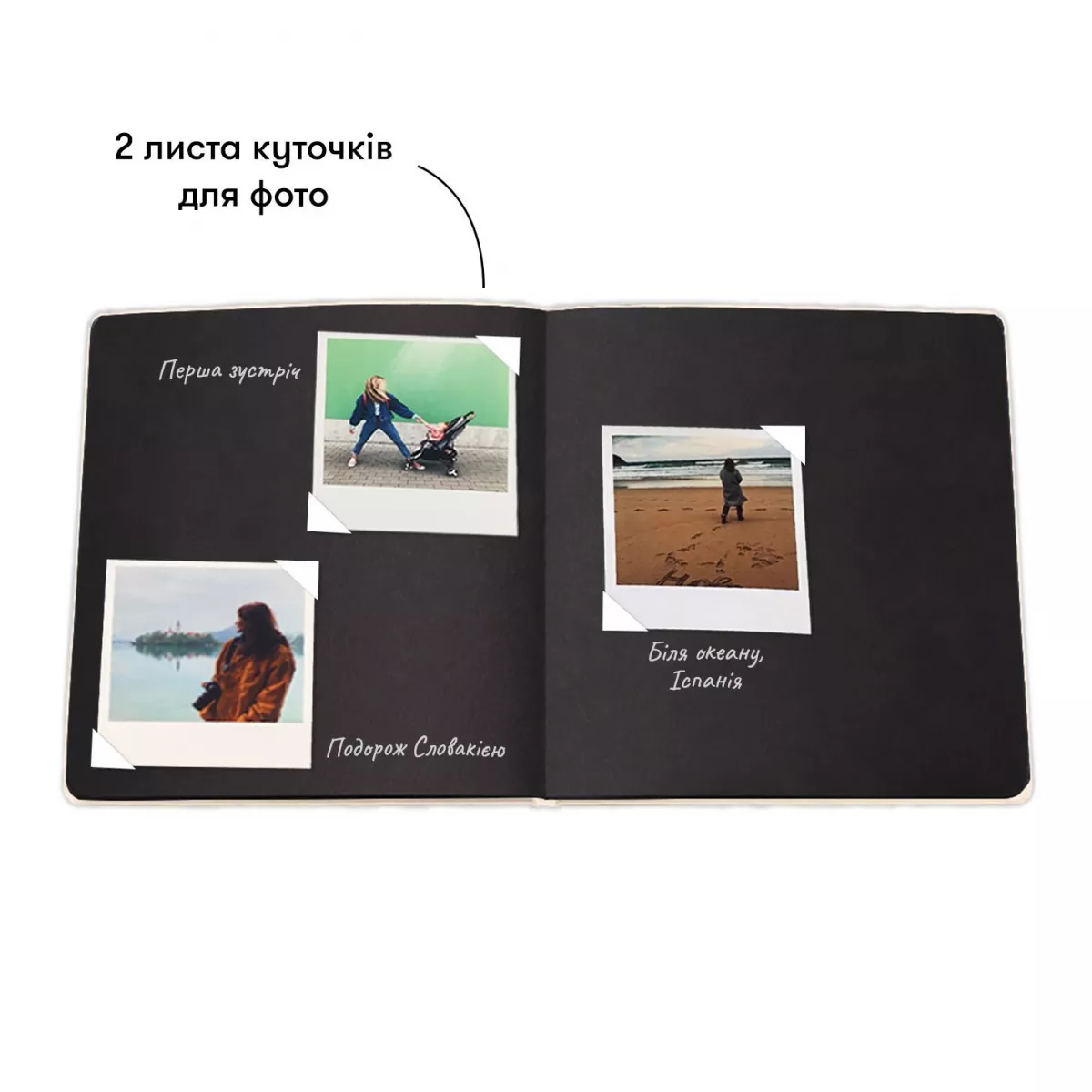 Сторінки фотоальбому квадратного формату чорного кольору, в комплекті 2 аркуші кутиків для фото. У альбомі можна розмістити фотографії різних розмірів. Напис на обкладинці виконаний тисненням.