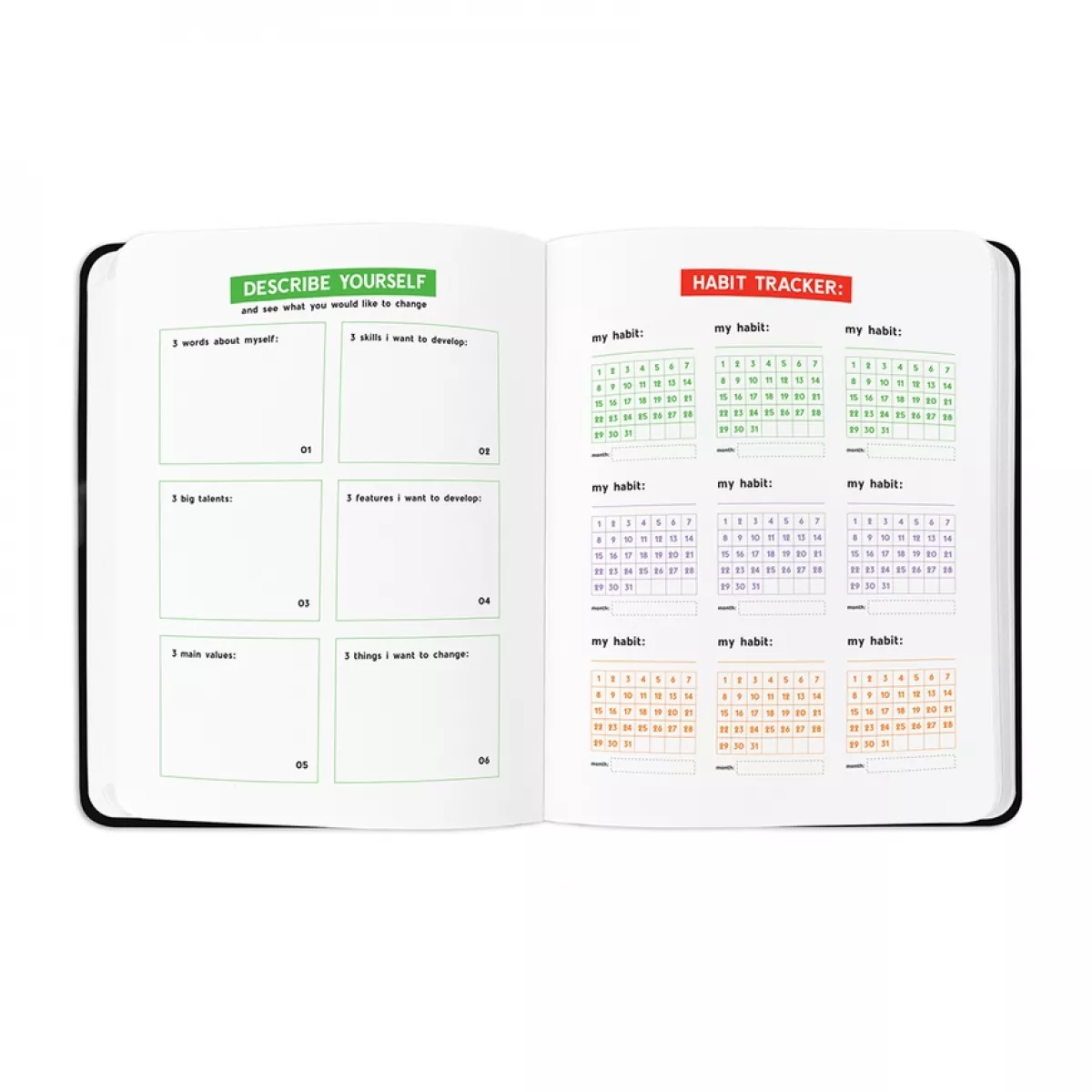 • Додаткові розвороти: план цілей на рік, дошка бажань, вишлісти, трекер звичок, поля для брейншторму та креативності, розворот підсумків року,