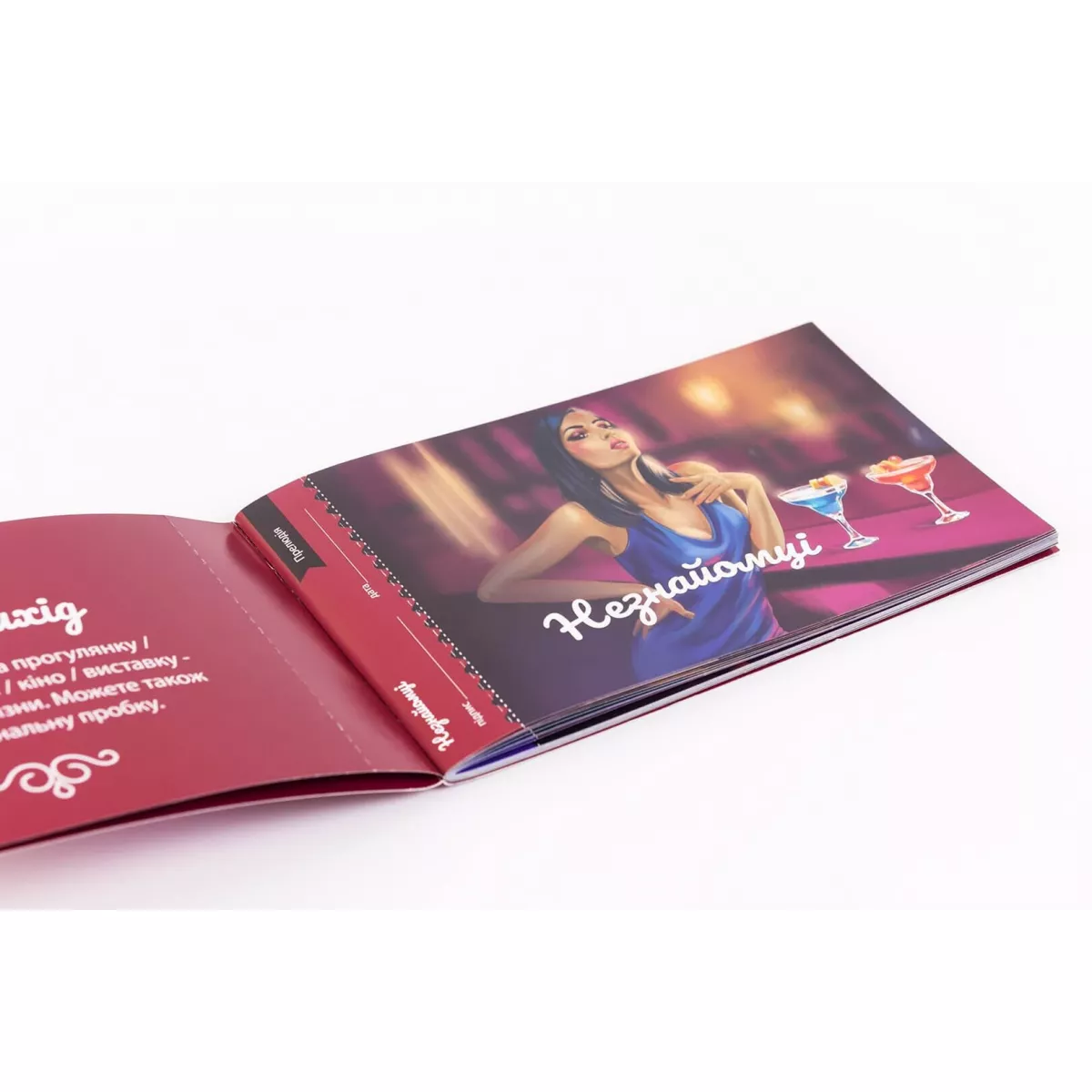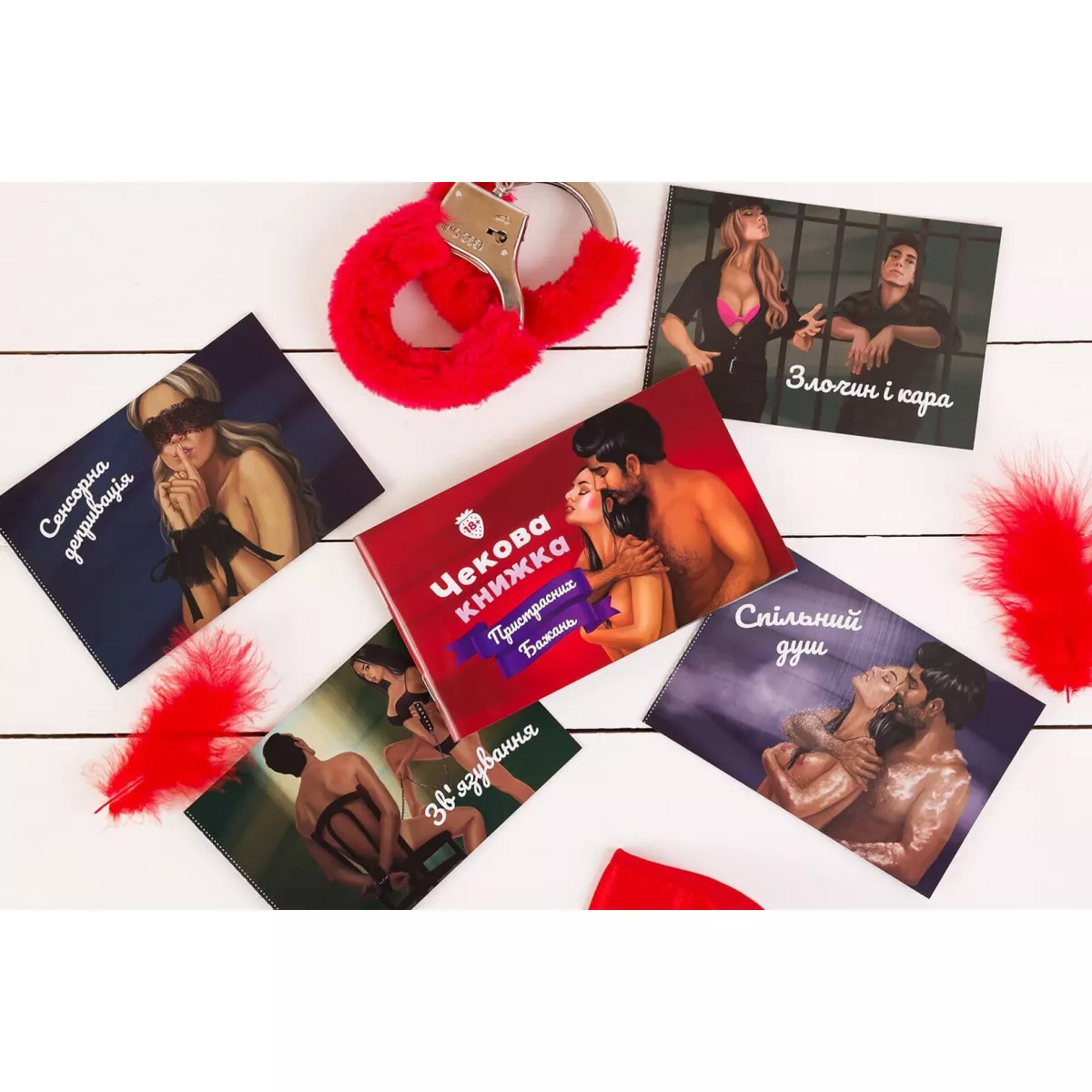 Чекова Книжка Пристрасних Бажань - це ідеальний подарунок для пристрасних і готових до нових відкриттів пар. Усередині ви знайдете 24 чека (завдання) різного ступеня відвертості. Як користуватися Чековою Книжкою Бажань Для вашої зручності всі бажання в Чекової книжці розділені на 5 категорій - Прелюдія, Ласки, Експерименти, Рольові ігри та Екстрім. Коли Ви з партнером будете готові - вибирайте бажання з будь-якої категорії і приступайте до його виконання. Після того, як чек «погашений», необхідно поставити позначку на його корінці. Чеки можуть бути використані неодноразово. Улюблені можете зберегти і повторити. Чим більше ви відкриті до нових завдань і експериментів, тим яскравіше будуть емоції і спогади. Але пам'ятайте, ця книжка всього лише задає напрямок, а слідувати йому чи ні - це ваш і тільки ваш вибір.