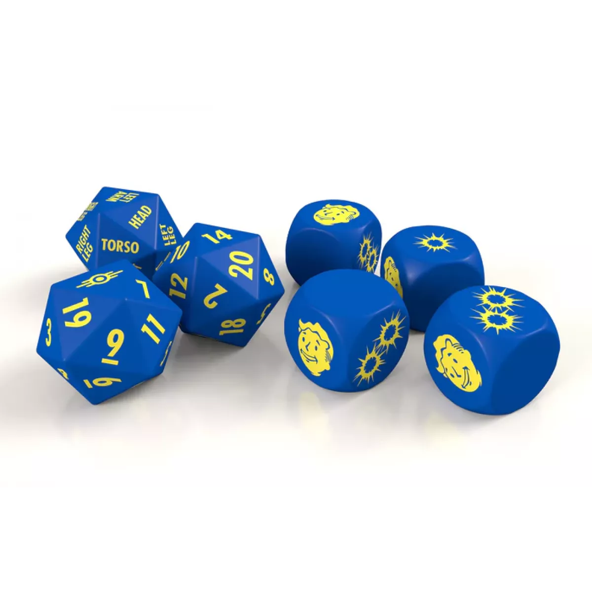 У коробці 1 D20 кубик для визначення місця ураження, 2 D20 кубики з логотипом VaultTec на грані «1», 4 D6 кубики для визначення пошкоджень із зображенням Vault Boy та влучань