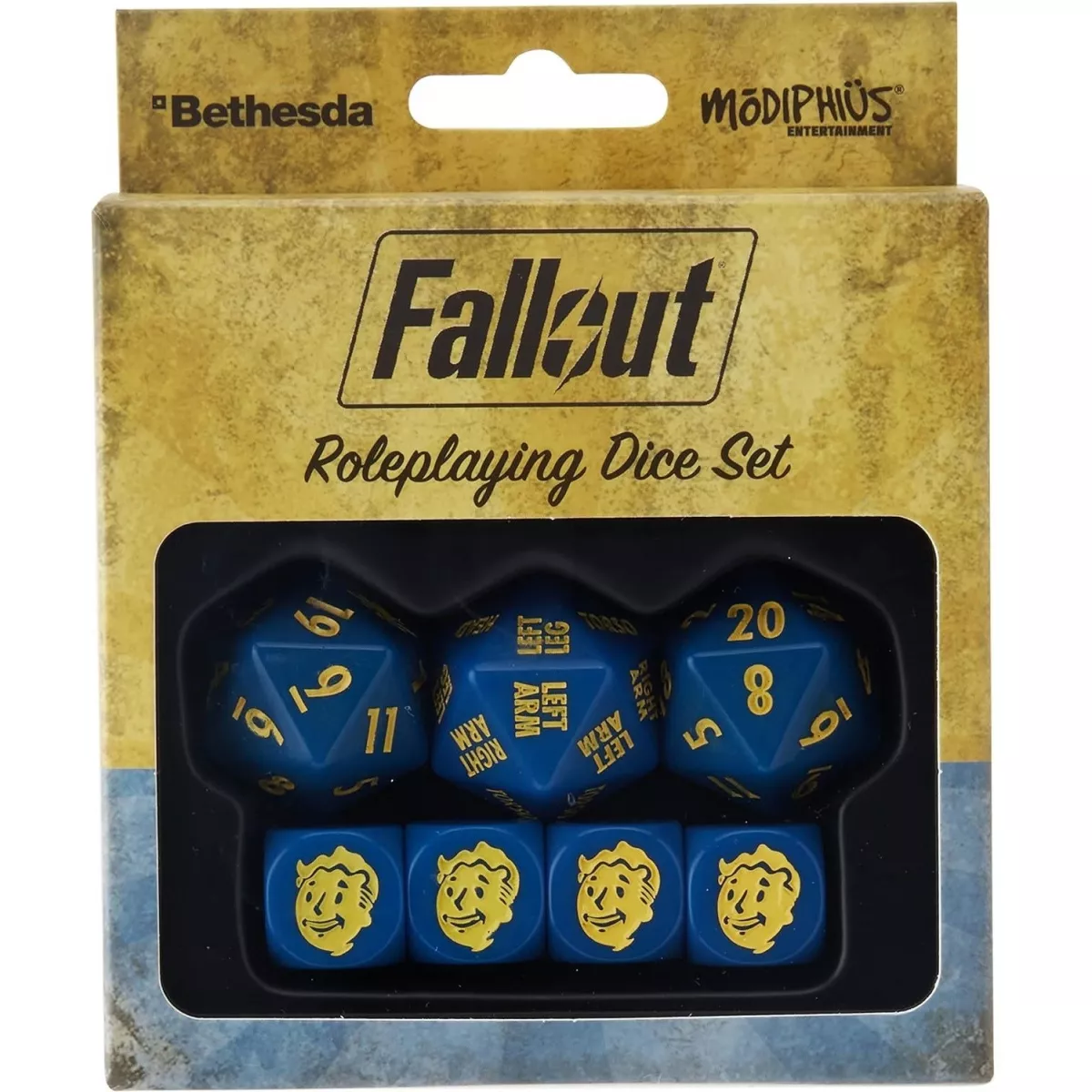 Fallout: The Roleplaying Game Dice Set — це набір стильних кастомних кісток, які ви можете використовувати під час гри в НРГ Fallout. Кістки ідентичні тим, що входять у «Fallout. Стартовий набір», але доступні для замовлення окремо.