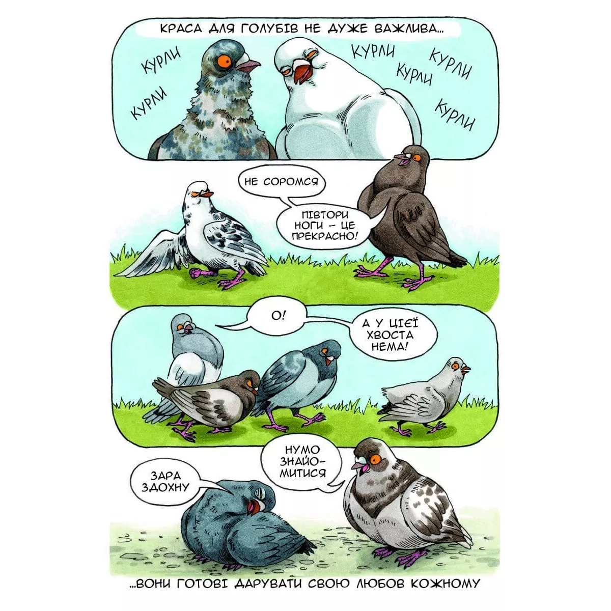 Чергова порція екзистенційної трагікомедії вже чекає на вас! Цього разу пригоди голуба Геннадія та інших пташок великого міста сповнені романтики. Кохання витає в повітрі, й опиратися йому неможливо. У другому томі авторка коміксу Koro не лише тішить іще більшою кількістю сатиричних замальовок пташиної буденності, а й продовжує сюжетні лінії своїх персонажів. Як склалося сімейне життя Лєни, чи вдалося Геннадію напоумити своїх пернатих родичів та чи готові птахи до неминучої зими? Іллюстратор KoRo Ілюстрації Кольорові Автор KoRo Вік 16-99 років Виробник MAL'OPUS Жанр Гумор Кількість сторінок 64 Країна-виробник товару Україна Мова Українська Палітурка М'яка обкладинка Папір Глянцевий Рік видання 2020 Розмір книги в мм 145х200х0,5