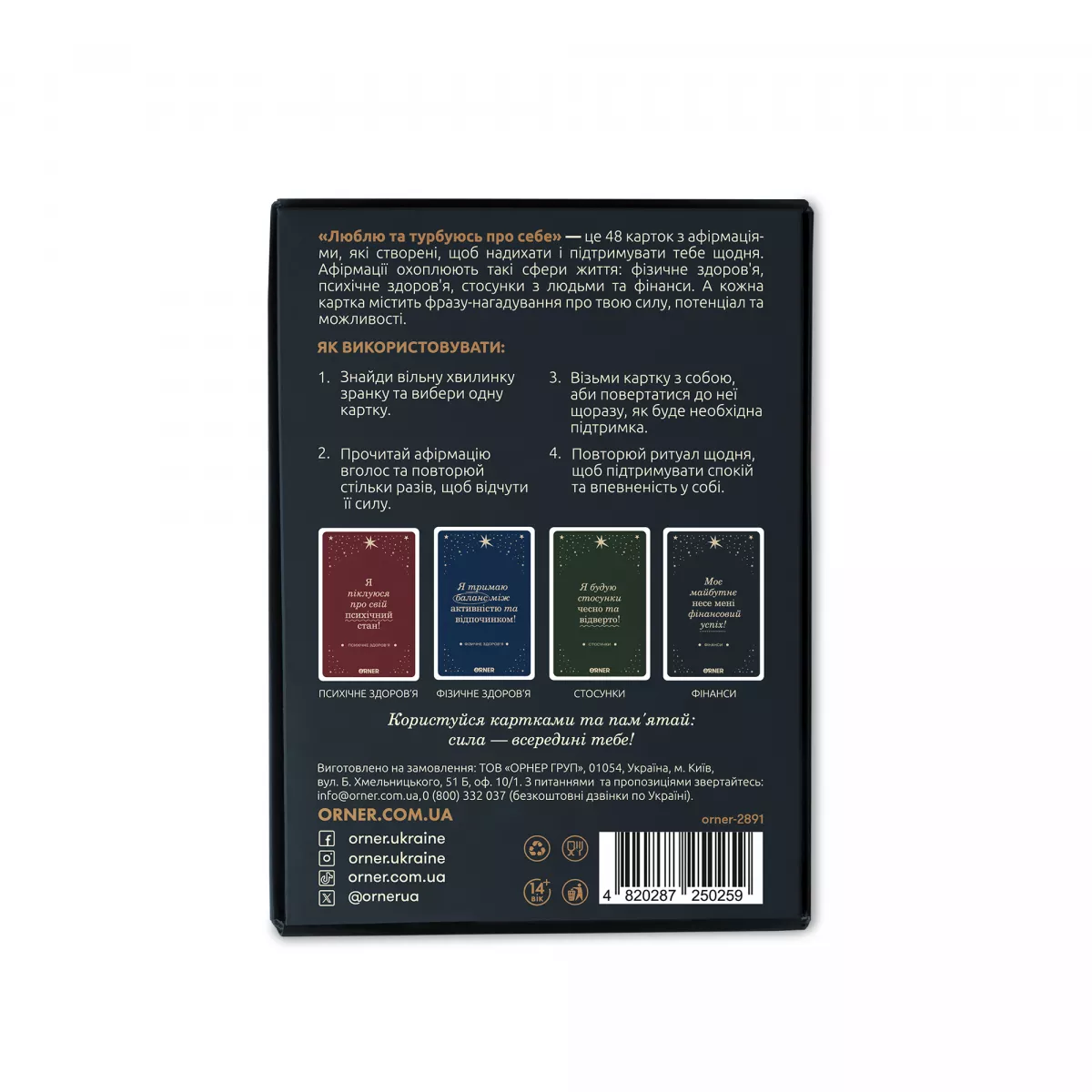 • Мова: Карти повністю україномовні, що робить їх доступними та зрозумілими для широкої аудиторії в Україні. Це дозволяє глибше зануритися у зміст афірмацій та легше їх інтегрувати у власне мислення.