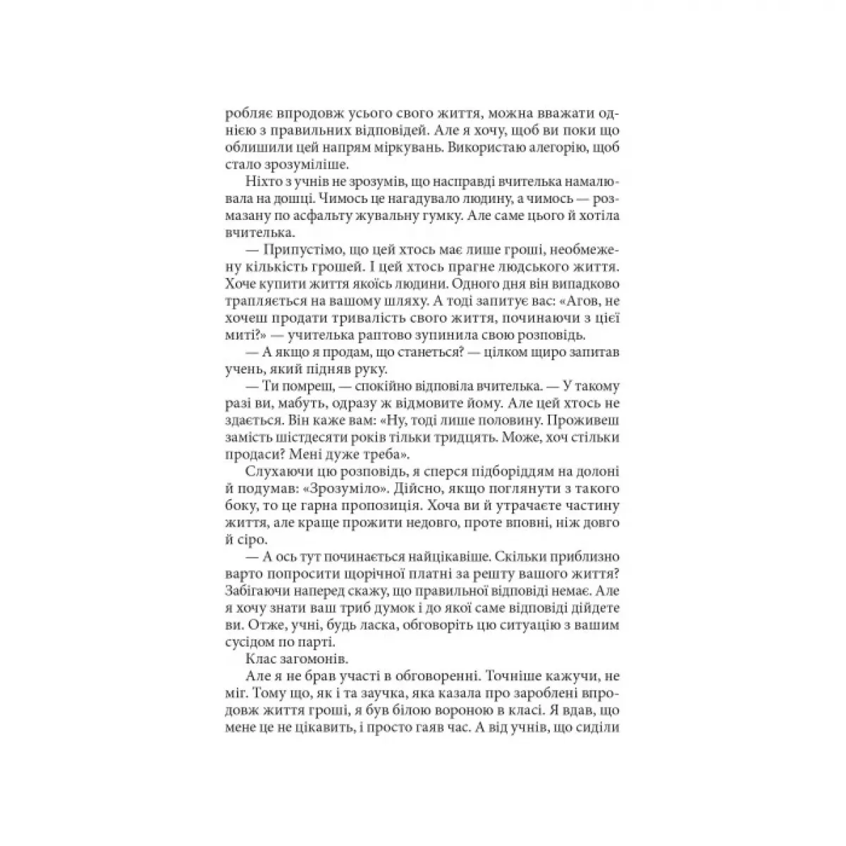 Крізь призму цієї незвичайної угоди, Суґару Міакі розглядає фундаментальні питання: що таке щастя? Чи можна його купити або продати? Яка справжня ціна часу, проведеного з близькими, чи моменту спокою та краси? Автор не дає готових відповідей, натомість запрошує читача до діалогу, до власного пошуку істини. Кожна сторінка цієї японської прози наповнена меланхолійною красою та психологічною глибиною, характерною для сучасної східної літератури.