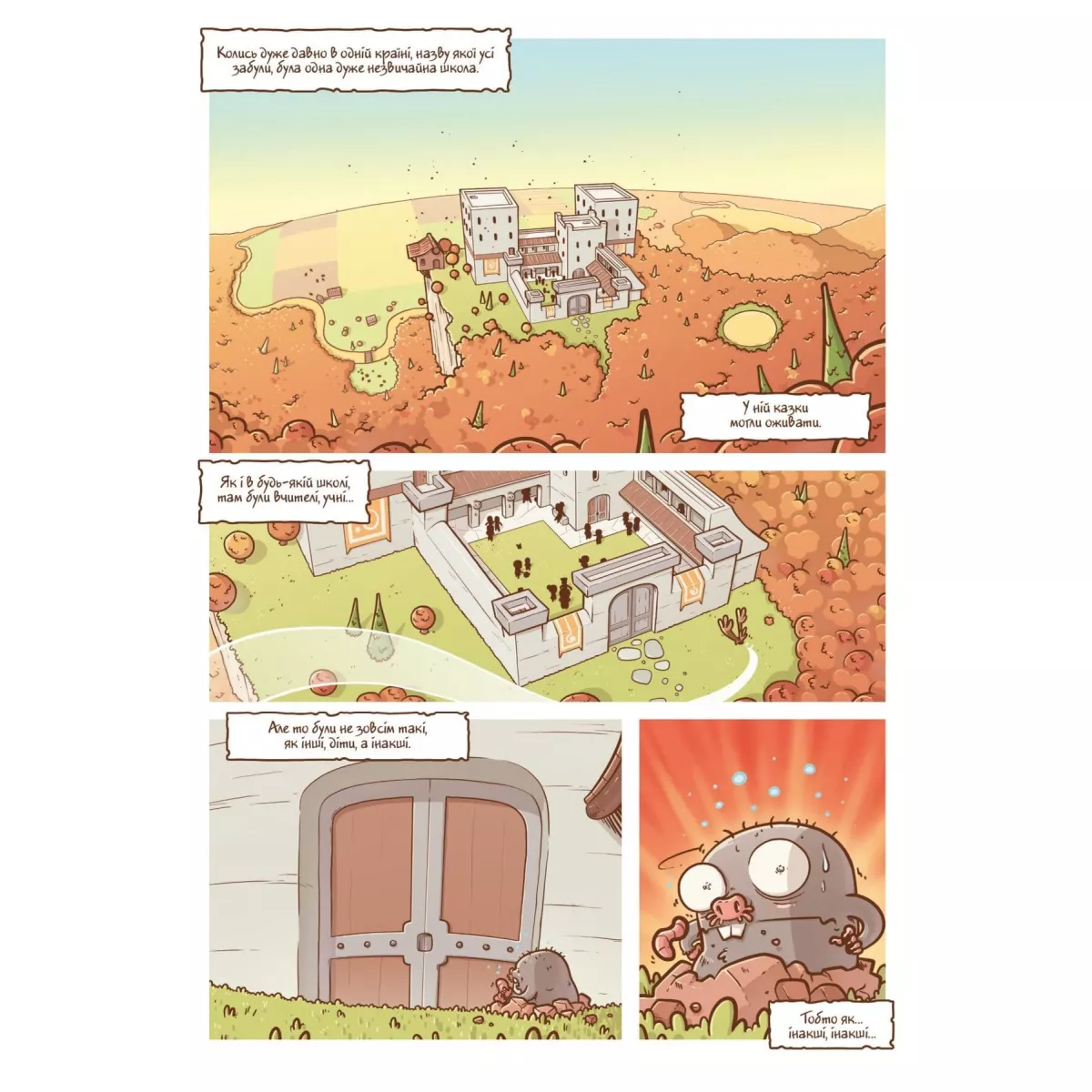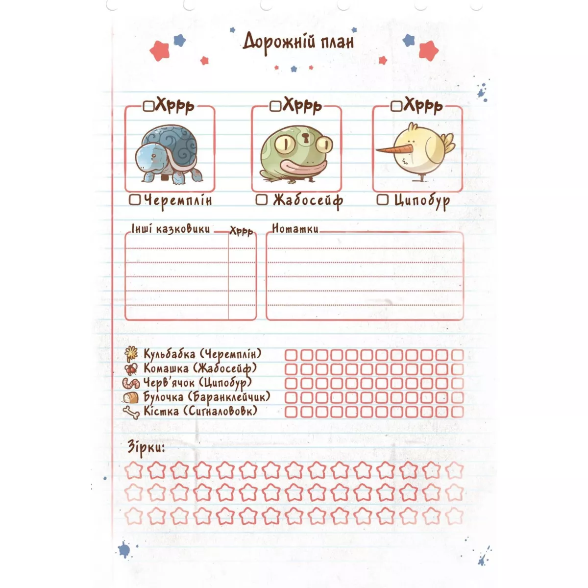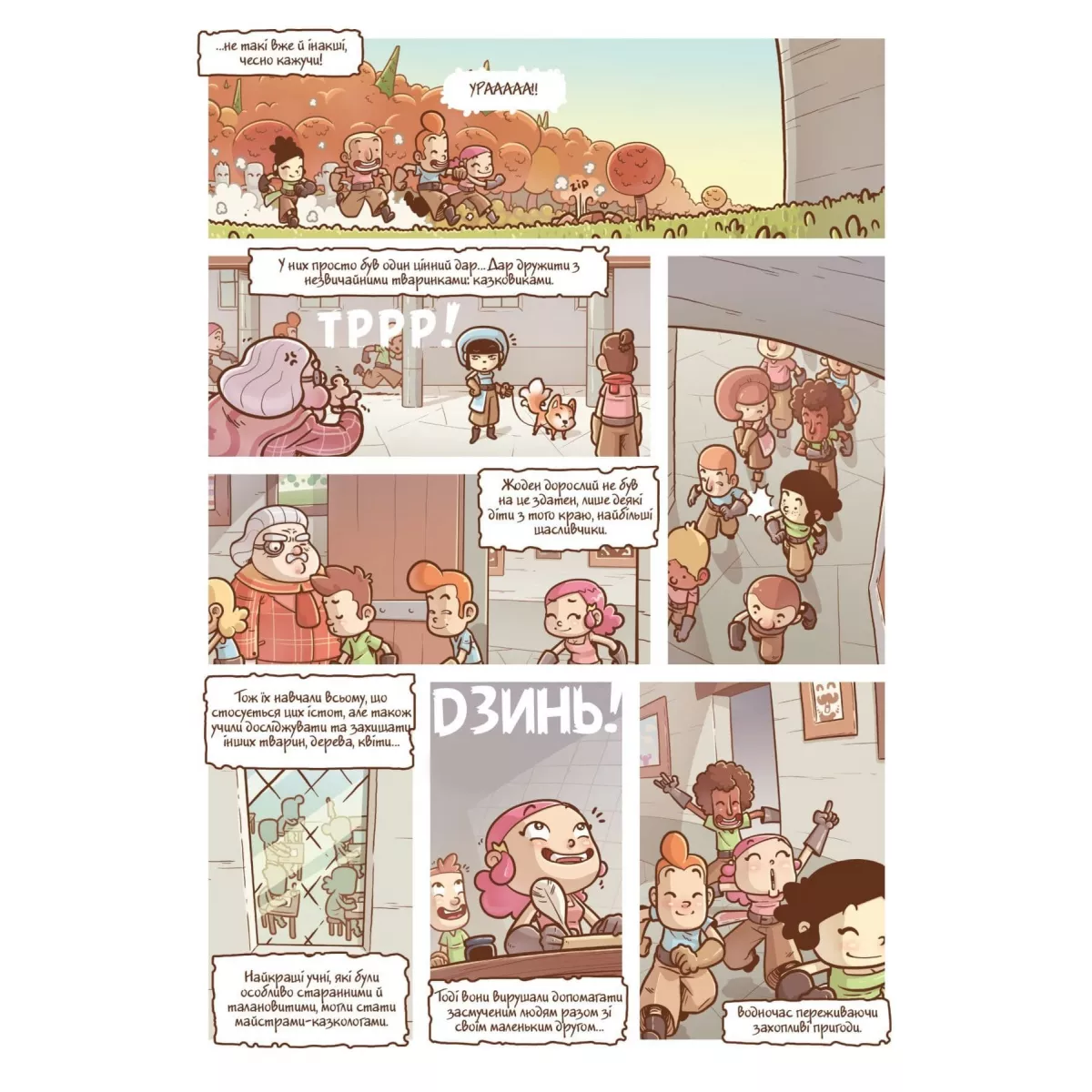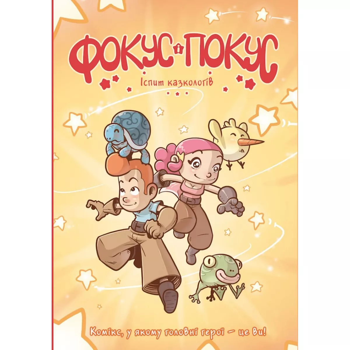 А що як у відомих казках є таємниці, які вам треба розгадати? Якщо ти любиш читання, ігри та чарівних звіряток, то можеш з головою зануритися у незвичайний комікс-квест “Фокус і Покус. Іспит казкологів”. Це поєднання комікса та гри, де ти можеш самостійно обирати свій шлях, приймати рішення, які впливають на розвиток подій, вирішувати загадки і навіть опікуватися чарівними істотами!  У цьому коміксі ти гратимеш або за Фокуса, або за Покус. Ти обираєш, що зробити і яким шляхом піти, аби виконати місію: відшукати двох дітей, що загубилися в лісі… Успіх залежить тільки від тебе, адже головний герой коміксу –  це ти!   Опис Все що тобі потрібно знати про комікс “Фокус і Покус. Іспит казкологів” ОБЕРИ КАЗКОВИКА: протягом усієї пригоди тобі допомагатиме незвичайна тваринка: казковик. Обирай! ЗБИРАЙ ІНВЕНТАР: ключ до успішного вирішення будь-якої справи це гарне спорядження. На твоєму шляху знайдеться все, що тобі потрібно, головне – уважно дивитися! РОЗВ’ЯЗУЙ ЗАГАДКИ: ти стикнешся з загадками, іграми та ребусами. Вирішуй їх правильно і отримуй щедру винагороду! ОТРИМУЙ ВИНАГОРОДУ: коли ти робиш хороші справи і особливо добре міркуєш, то отримуєш за це зірки. Як грати То ти вже готовий грати? Тоді починай читати історію з початку. Ти познайомишся зі світом Фокуса та Покус, побачиш їхню школу, та дізнаєшся про випробування, яке чекає на тебе. Оскільки ти головний у цій історії, то обирай за кого будеш грати – за Фокуса або за Покус, і яке магічне звірятко візьмеш із собою у пригоду. Потім переходь на панель для обраного персонажа і починай свою пригоду! Кожні кілька панелей тобі треба робити вибір або долати перешкоди, відправляючись на інші панелі комікса. Рухайся сторінками, щоб знайти потрібні номери і продовжуй читати. Уважно придивися чи всі замасковані номери панелей, підказки чи інвентар знайдені. Просуваючись історією, ти натраплятимеш на загадку або ребус, які потрібно розв’язати перш ніж продовжити свої пригоди. Це може бути щось від простих математичних рівнянь та лабіринтів, до складніших головоломок та логічних загадок, завдяки яким комікс ще більше нагадує гру. Якщо ти даш правильну відповідь, то будеш нагороджений зірками! Не забувай позначати зароблені зірки в Дорожньому плані. Дорожній план Використовуй дорожній план, щоб відмітити обраного казковика, кількість зароблених зірок, знайдене спорядження та інше. Пригода Фокуса і Покус починається з дорожного плану, який потрібно заповнювати олівцем, щоб потім мати змогу робити нові відмітки, коли гратимеш наступного разу. Якщо не хочеш писати в книжці, можеш зняти з нього копію. Відмічай чи твоє магічне звірятко спить чи ні, або може ти завів ще одного казковика під час пригод, не забудь і про нього, занотуй скільки улюблених харчів вдалося знайти для них. В табличці “Нотатки” можна записувати різні важливі слова, інвентар, або інші знахідки, якими можуть поділитися люди, яких ти зустрінеш. А якщо ти помітив зірку, яка ховається на панелі, яку ти читаєш, обов’язково відміть її на своєму дорожному плані. Збери їх якнайбільше, щоб вразити вчителів і заробити кращий бал у кінці місії! Для початку обери собі персонаж Фокус і Покус це брат і сестра, які навчаються у школі у казковому світі, де дітей навчають бути господарями магічних істот, захищати тварин, дерева та квіти. Фок