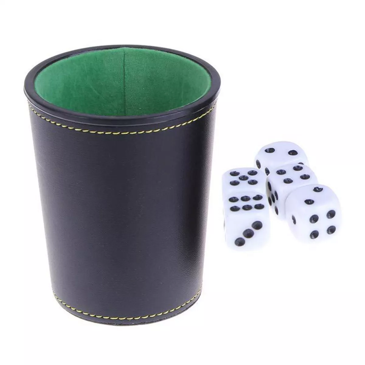 Цей набір для гри в кості складається зі стильної чашки з екошкіри та п'яти класичних гральних кубиків. Чашка виконанана з якісної чорної екошкіри з акуратною декоративною строчкою та м'яким зеленим покриттям всередині, що забезпечує тихе та приємне перемішування кубиків. Такий набір ідеально підходить для настільних ігор, що потребують кубиків, і стане чудовим доповненням до вашого ігрового арсеналу.