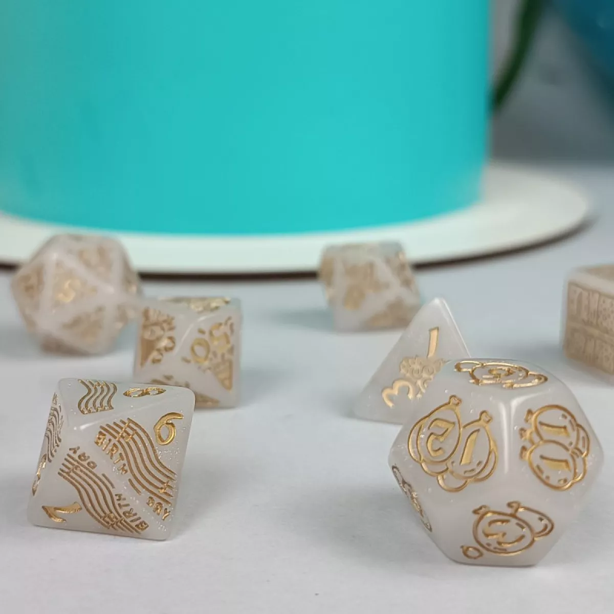 Універсальний набір, що складається з восьми стильних гральних кубиків - двох чотиригранників (один зі скругленими гранями та класичний), шестигранника, восьмигранника, десятигранника, десятигранника з числами другого розряду, дванадцятигранника і двадцятигранника.