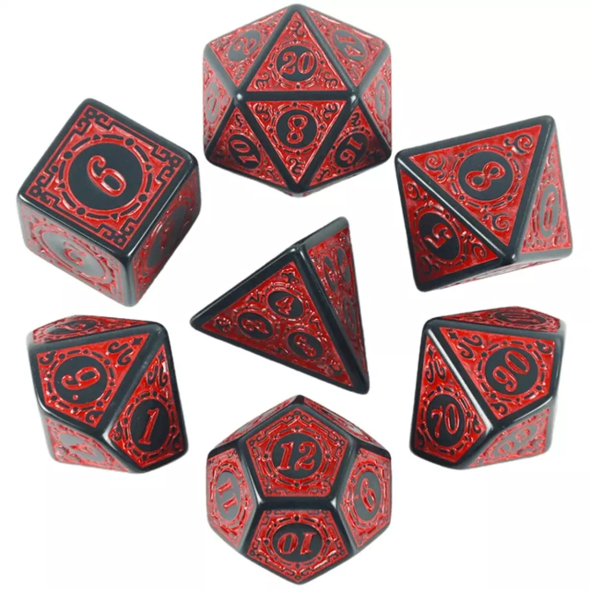 Цей набір гральних кубиків включає 7 різних типів: D4, D6, D8, D10, D00, D12, D20, виконаних у чорному кольорі з червоними цифрами. Вони чудово підходять для настільних рольових ігор, таких як Dungeons & Dragons та інших настільних ігор, що використовують багатогранні кубики. Контрастний червоний колір цифр забезпечує легкість читання, а міцний пластик гарантує довговічність використання. Цей стильний набір стане відмінним доповненням до колекції будь-якого гравця в RPG ігри.
