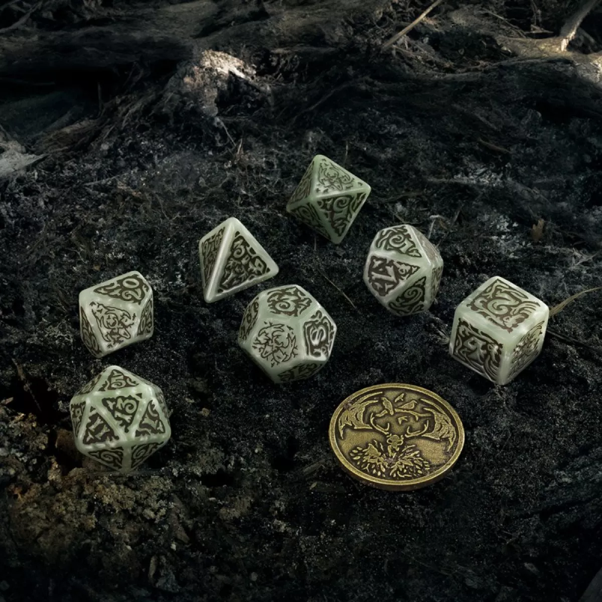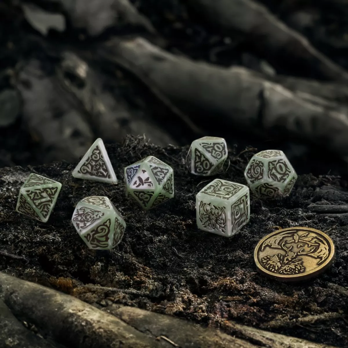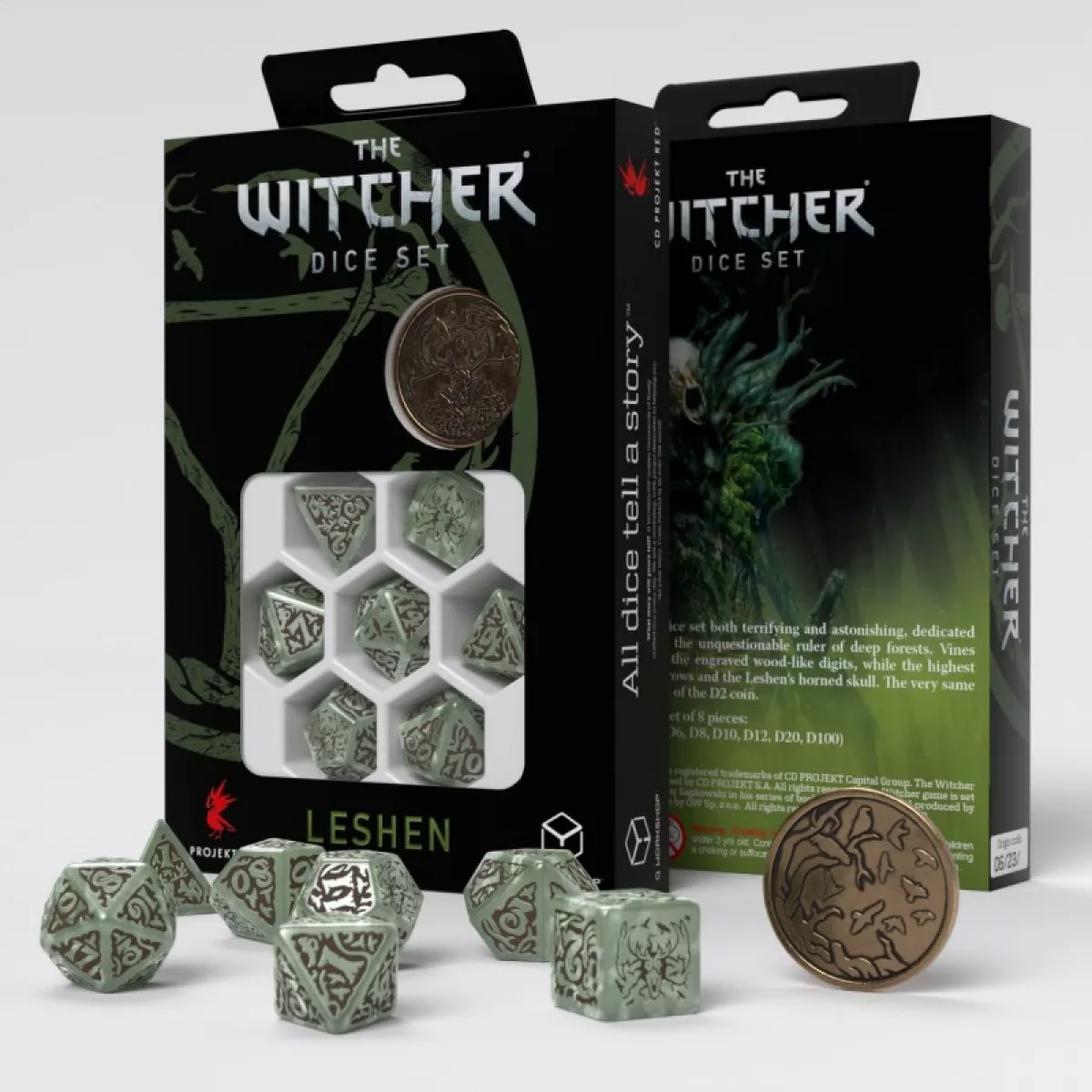 Дизайн цих кубиків натхненний одним з найстрашніших та найзагадковіших монстрів у всесвіті Відьмака – Лешим (або Лісовиком). Леший – це прадавній дух лісу, що володіє надзвичайною силою та моторошною мудрістю. Він є захисником дикої природи, що безжально карає тих, хто посягає на його володіння. Кольорова гама кубиків відтворює темні відтінки лісових хащів, моху та землі, створюючи відчуття занурення у справжній праліс. Символіка на гранях кубиків містить елементи, що відсилають до тотемів, ритуальних знаків та містичних рун, які асоціюються з Лешим та його зв'язком з природою. Кожен кидок цих кубиків – це не просто генерація випадкових чисел, а звернення до древніх сил лісу, що можуть як принести вам удачу, так і обернутись проти вас.