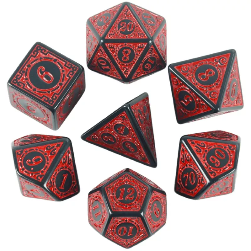 Цей набір гральних кубиків включає 7 різних типів: D4, D6, D8, D10, D00, D12, D20, виконаних у чорному кольорі з червоними цифрами. Вони чудово підходять для настільних рольових ігор, таких як Dungeons & Dragons та інших настільних ігор, що використовують багатогранні кубики. Контрастний червони..