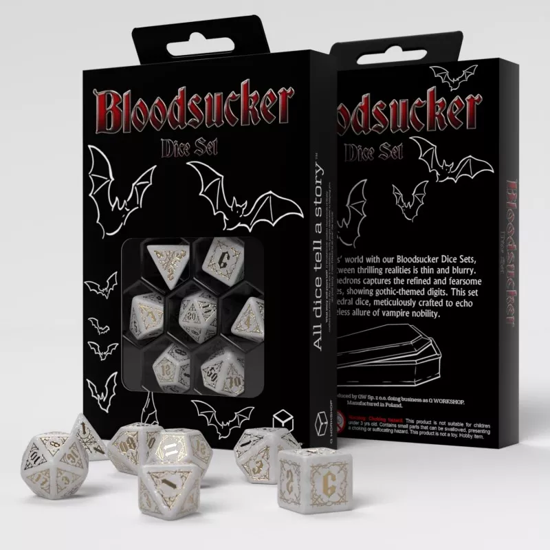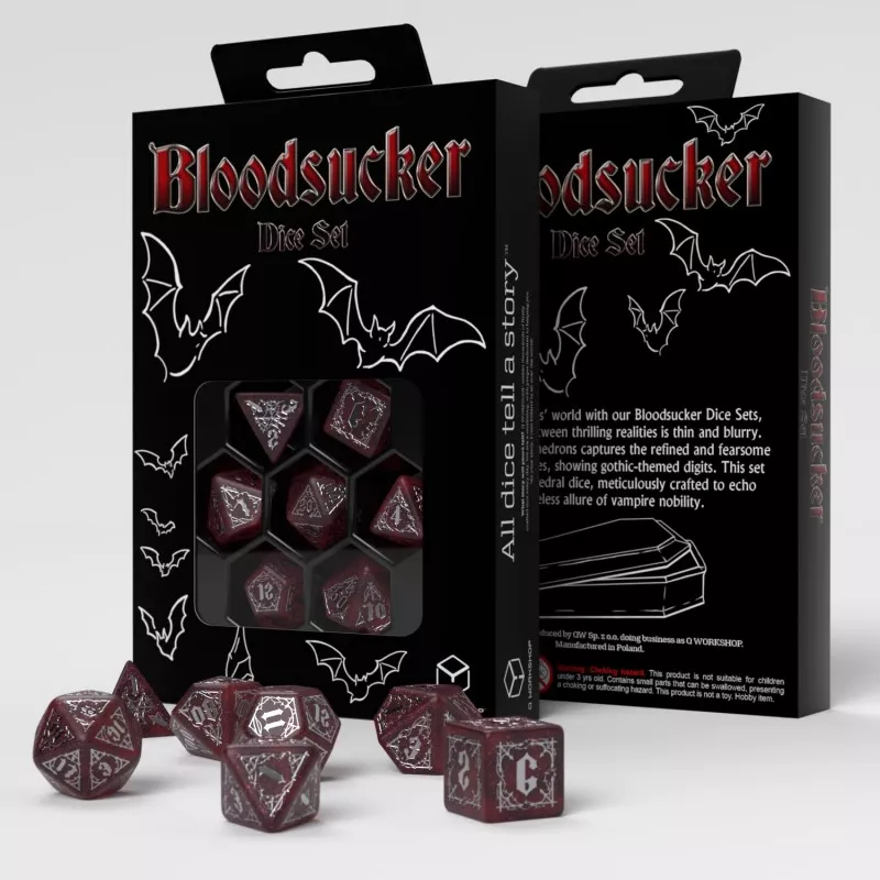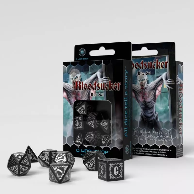 Чорно-срібний набір кубиків BloodsuckerQ WORKSHOP з гордістю представляє неперевершений набір багатогранних кубиків Bloodsucker Polyhedral Dice Set, унікальний і найкращий для всіх безсмертних героїв або вбивць нежиті. Ці кубики були знайдені глибоко в шухляді нашого секретного проекту, засипані зем..