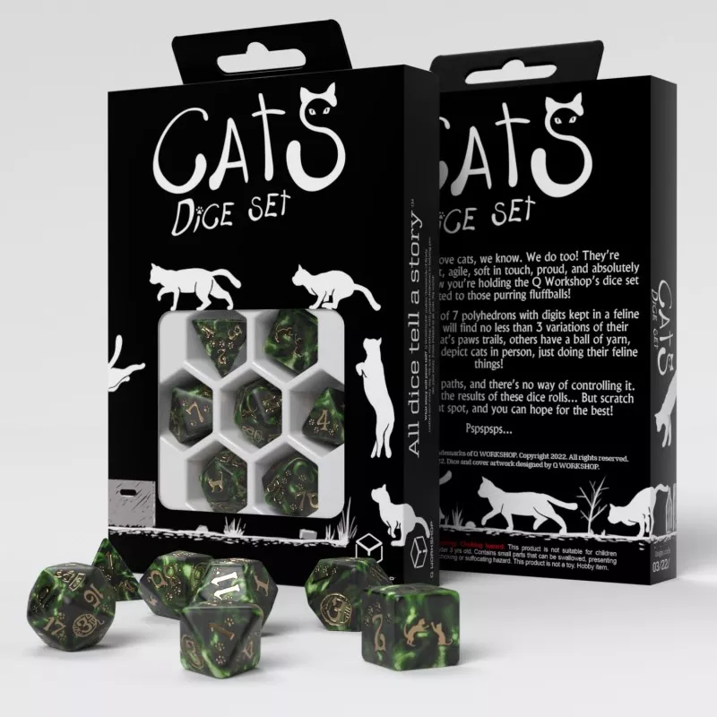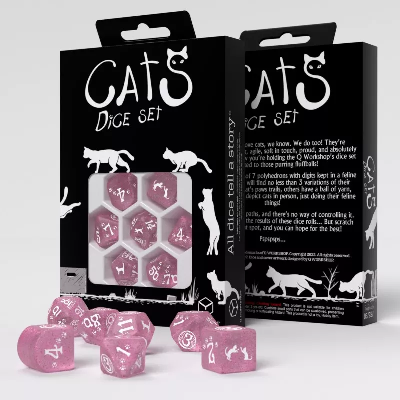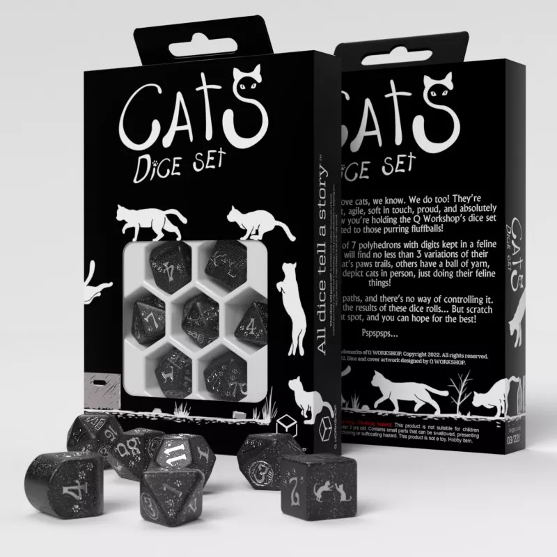 Дивіться сучасний набір кубиків CATS: Waffle! Ці кубики чорні, як ніч, виблискують безліччю крихітних зірочок; ефект, який створюється матеріалом, змішаним із блискучим пилом. Гравюри пофарбовані в матовий сріблястий колір, що робить їх містичними та показує грайливих котів у їхній повсякденній діял..