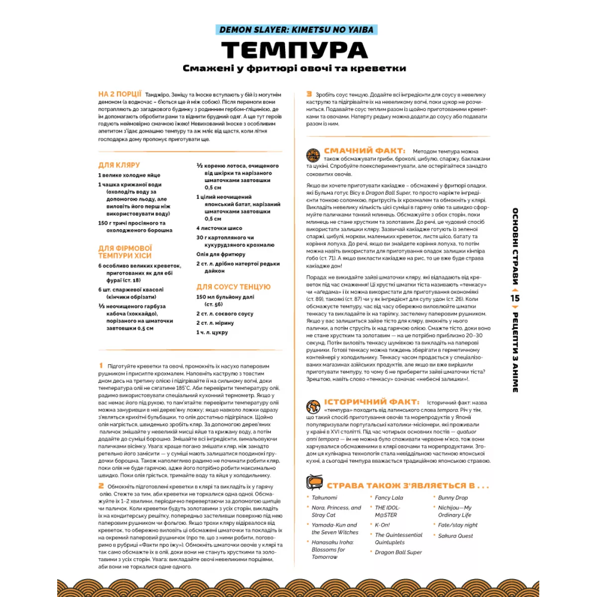 Японія має культ їжі, треба готувати її таким чином, щоб вона була і корисною, і дуже смачною, і виглядала красиво! І у багатьох аніме, коли герої готують попоїсти, то аж слинки течуть! І здається, що це ж лише анімація, в житті неможливо зробити так смачно та красиво. А от і можливо - завдяки Кулінарній книзі рецептів з аніме! Що забажаєте на обід? В меню сьогодні: — Темпура з «Клинок, який знищує демонів» — Місо-рамен чяшю з «Наруто» — Окаю з «Принцеса Мононоке» — Оніґірі з «Кошик фруктів» — Таякі з «Моя геройська академія» — Ханамі данґо з «Кланнад» та інші страви з понад 500 аніме! У книзі так детально описано спосіб приготування, що впорається навіть новачок на кухні! Ба більше, якщо ви не плануєте сьогодні готувати, то можна просто пороздивлятися високоякісні малюночки смачнючої їжі, або почитати цікаві факти про її особливості або улюблені аніме, якими щедро усипані сторінки кулінарної книги! Тож Кулінарна книга Рецептів з аніме стане і прикрасою вашої книжкової полички, і помічником на кухні, і гарним подарунком будь-якому фанату аніме! Якщо ж у вас апетит розігрався не на жарт, варто звернути увагу на швиденьку смачненьку настілочку Рамен! Рамен!