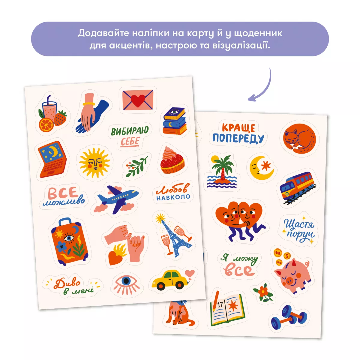 - Наліпки (2 аркуші 120х160 мм): Стильні стікери для оформлення вашої карти та щоденника.