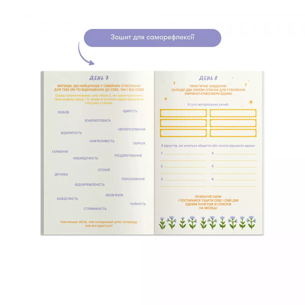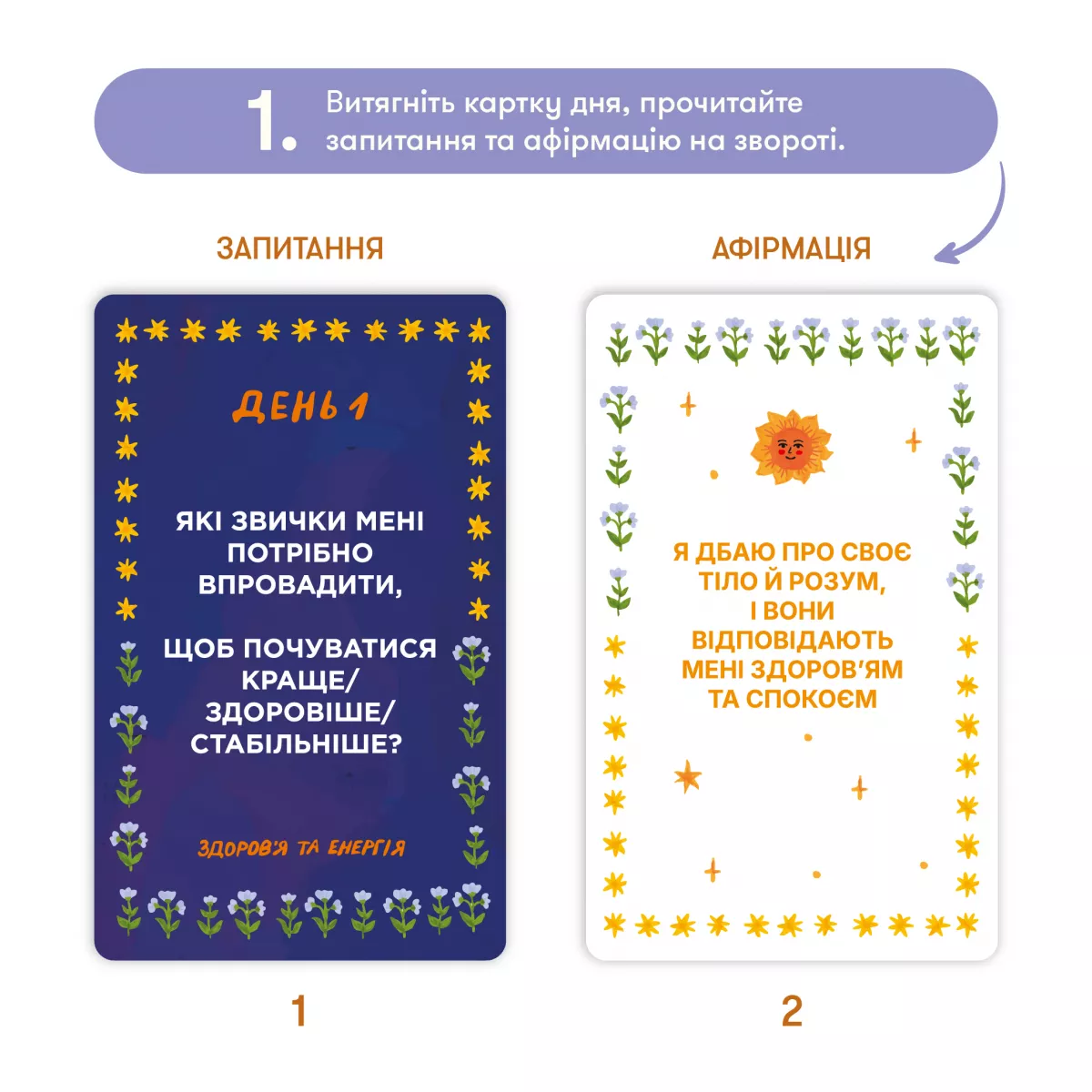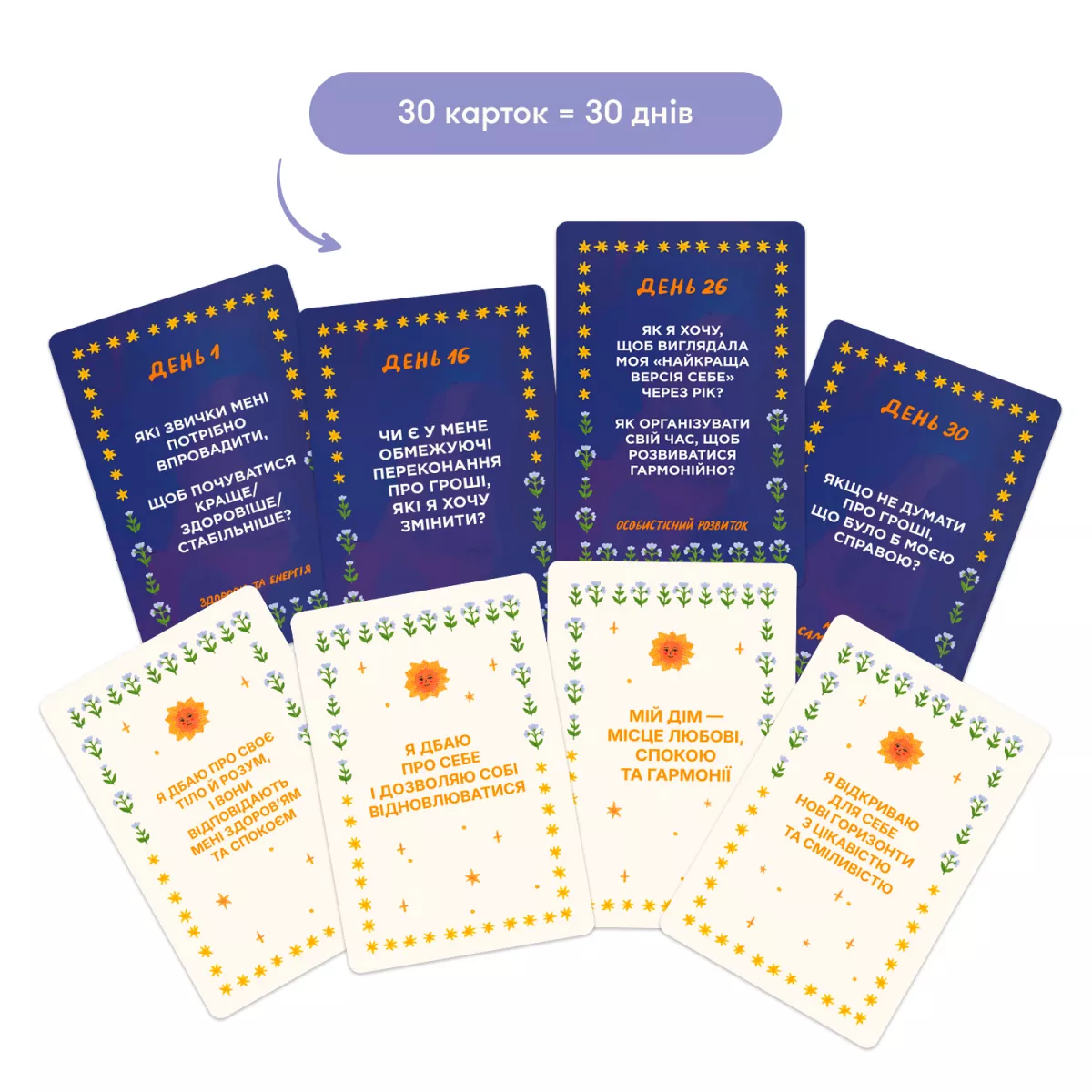 - Картки для саморефлексії (30 шт.): Розмір 68х110 мм, із глибокими питаннями на кожен день.