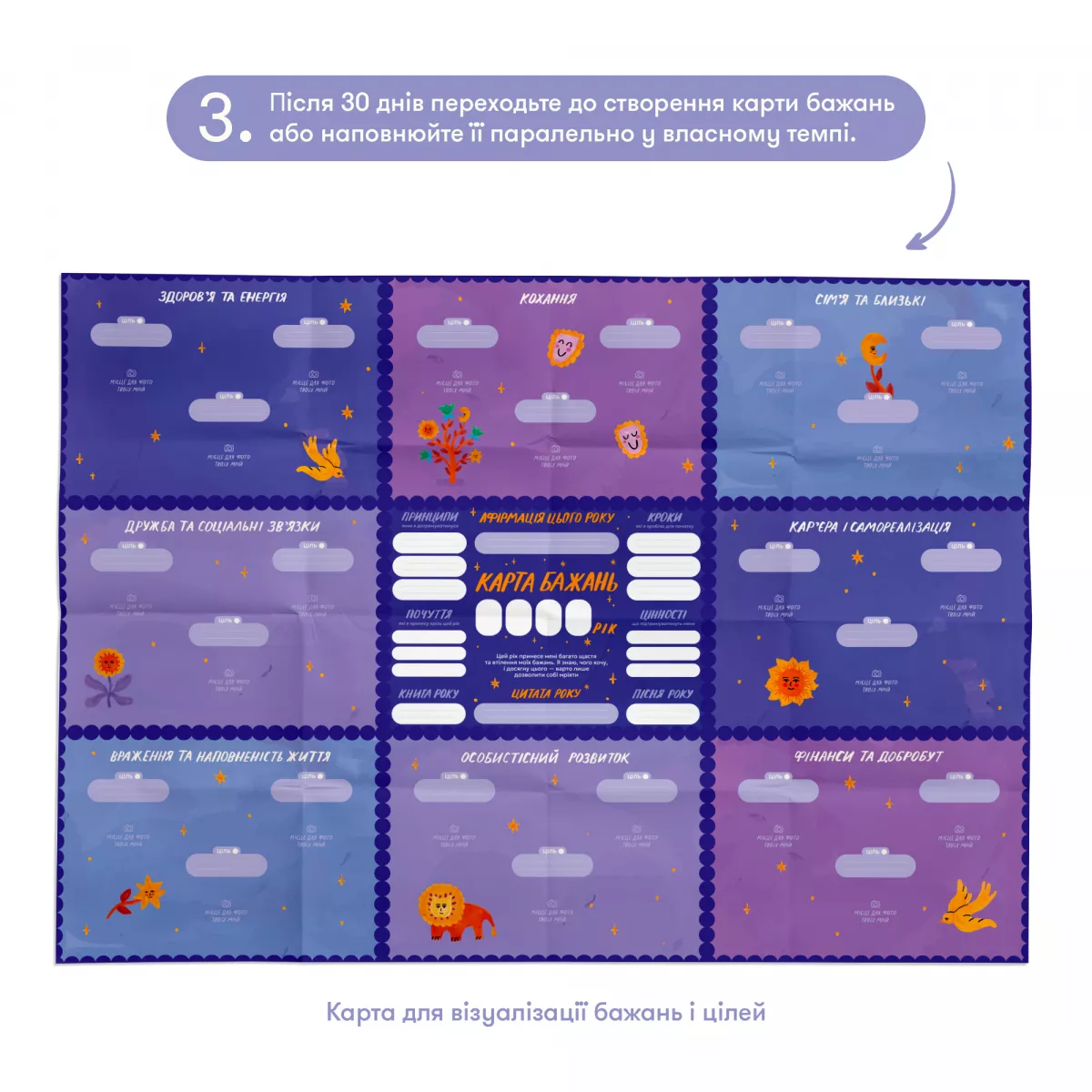 Процес створення карти не робиться за один вечір. Він розрахований на цілий місяць усвідомленої роботи. Крок за кроком ви будете: