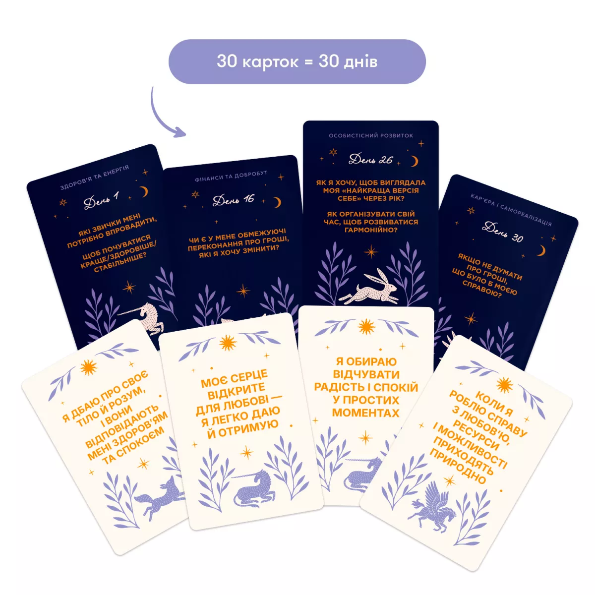 - 30 карток для саморефлексії (68х110 мм): Ваш щоденний провідник до власних мрій.