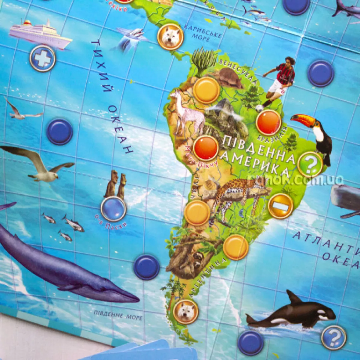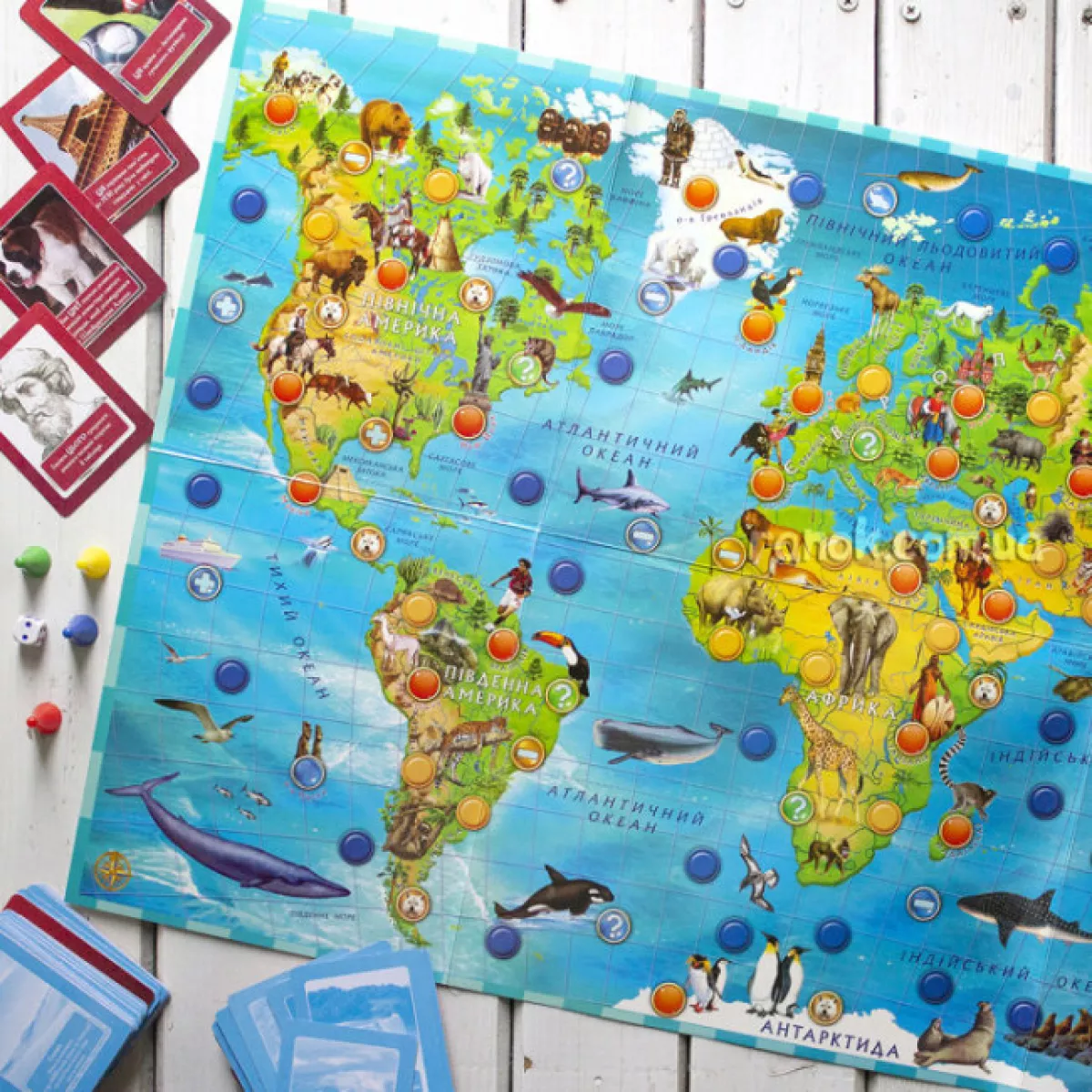 Ця гра може стати першим знайомством з усією планетою. В комплекті міні-енциклопедія, як дозволить пізнати світ і мати змогу відповідати на питання вікторини. А картки з тваринами покажуть малечі як виглядає фауна Землі.