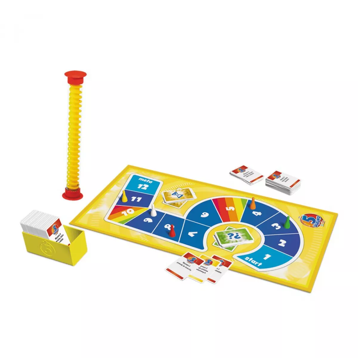 У коробці ігрове поле, 354 двосторонні картки з питаннями (708 питань), 18 карт "Наступний", 18 карт "Заміна", 6 фішок гравців, коробочка для карт, спеціальний таймер-спіраль, правила гри