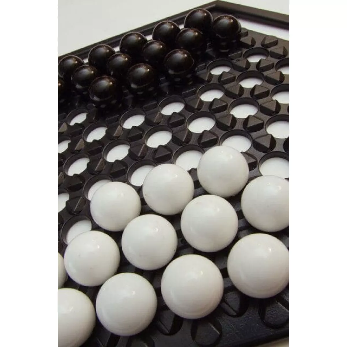 У коробці ігрове поле, 14 білих кульок, 14 чорних кульок, правила гри