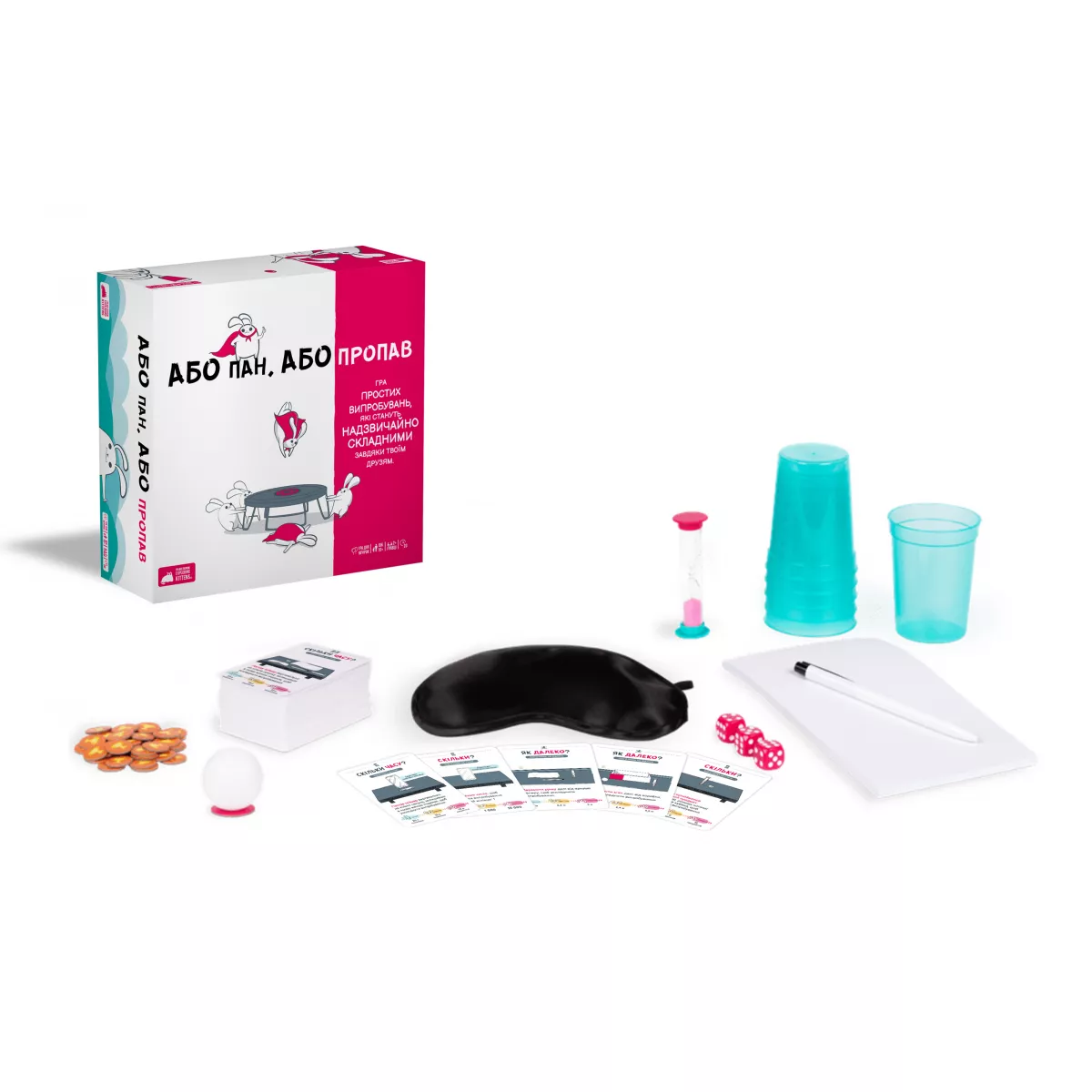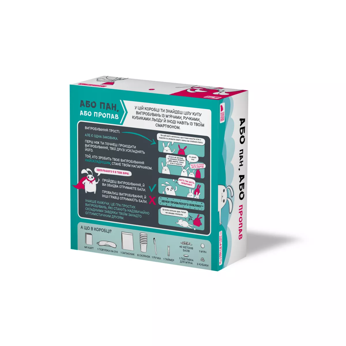 «Або пан, або пропав» — шалений творчий патігейм на спритність. У центрі гри — сміливець, якому належить пройти випробування, щедро ускладнене його «напарником». Саме той, хто вигадає для тебе найжорсткіші умови, і стане твоїм союзником — розділяючи з тобою або тріумф, або поразку. Але в разі провалу — жодного сорому! Просто твій друг… трохи переоцінив твої можливості. З любові, звісно. Це весела гра, у якій потрібні сміливість, кмітливість і хороший запас фатального оптимізму.