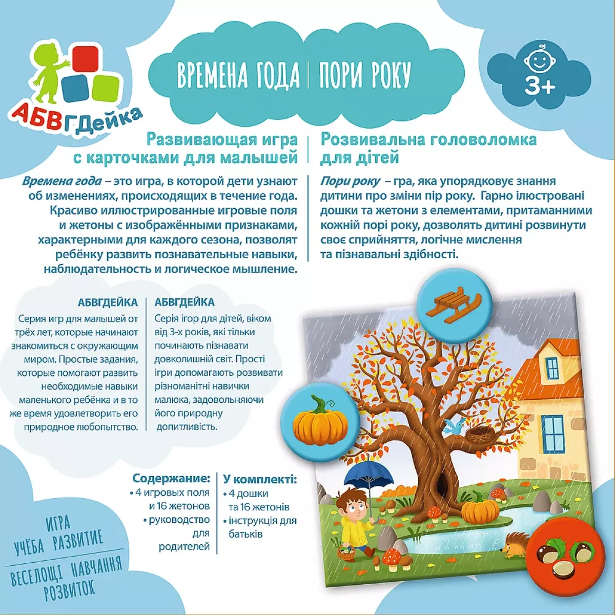 «Пори року» - розвивальна мовонезалежна головоломка з великими деталями, зручними для гри з дітьми. Включає чотири щільних картонних планшети з зображенням пор року, та дрібніші елементи, які необхідно буде сортувати та співвідносити з картинкою. Одночасно можуть грати від 1 до 4 дітей від 3 років.