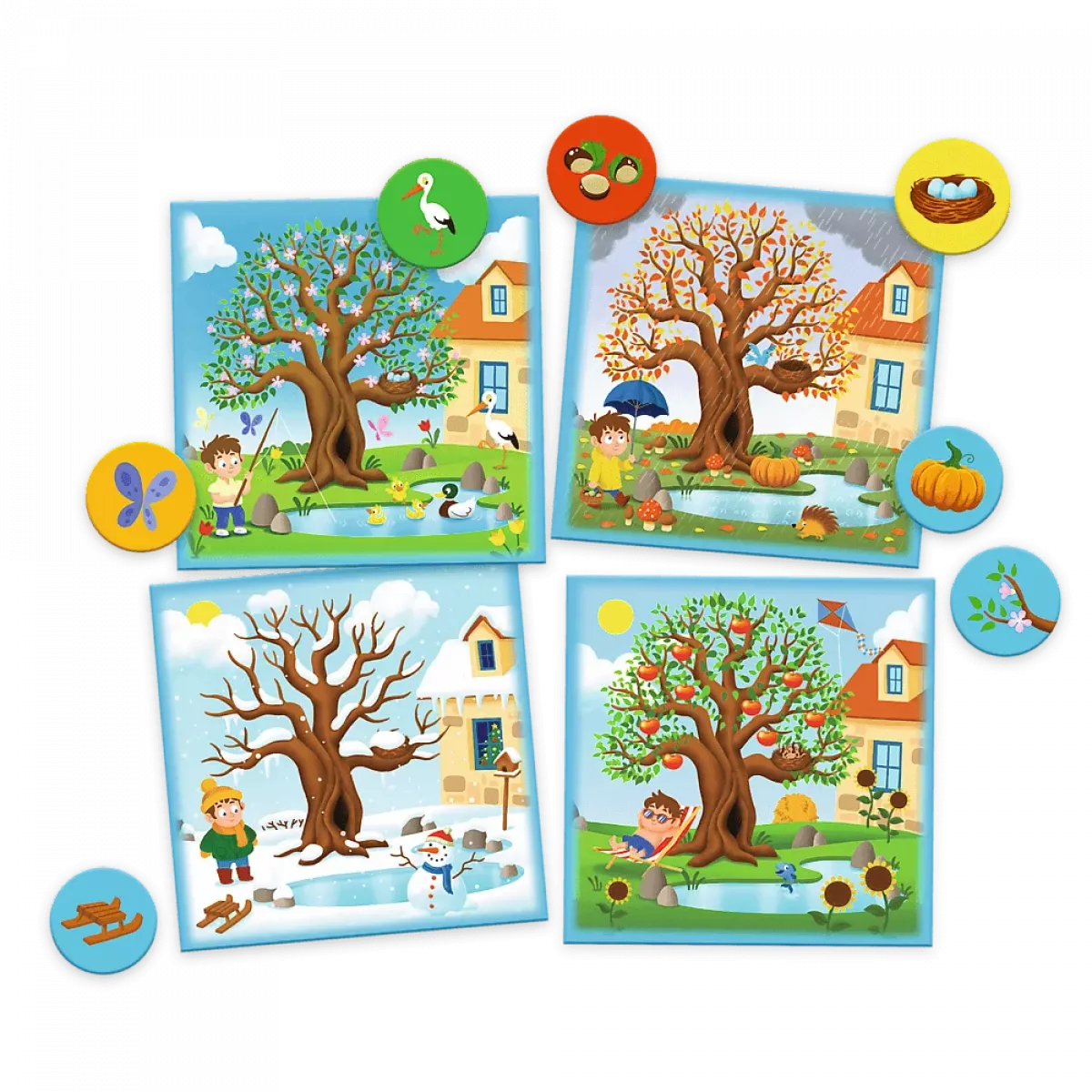 У коробці 4 планшети з великими ілюстраціями, що відображають 4 пори року, 24 двосторонні картки з окремими елементами картинок, правила гри