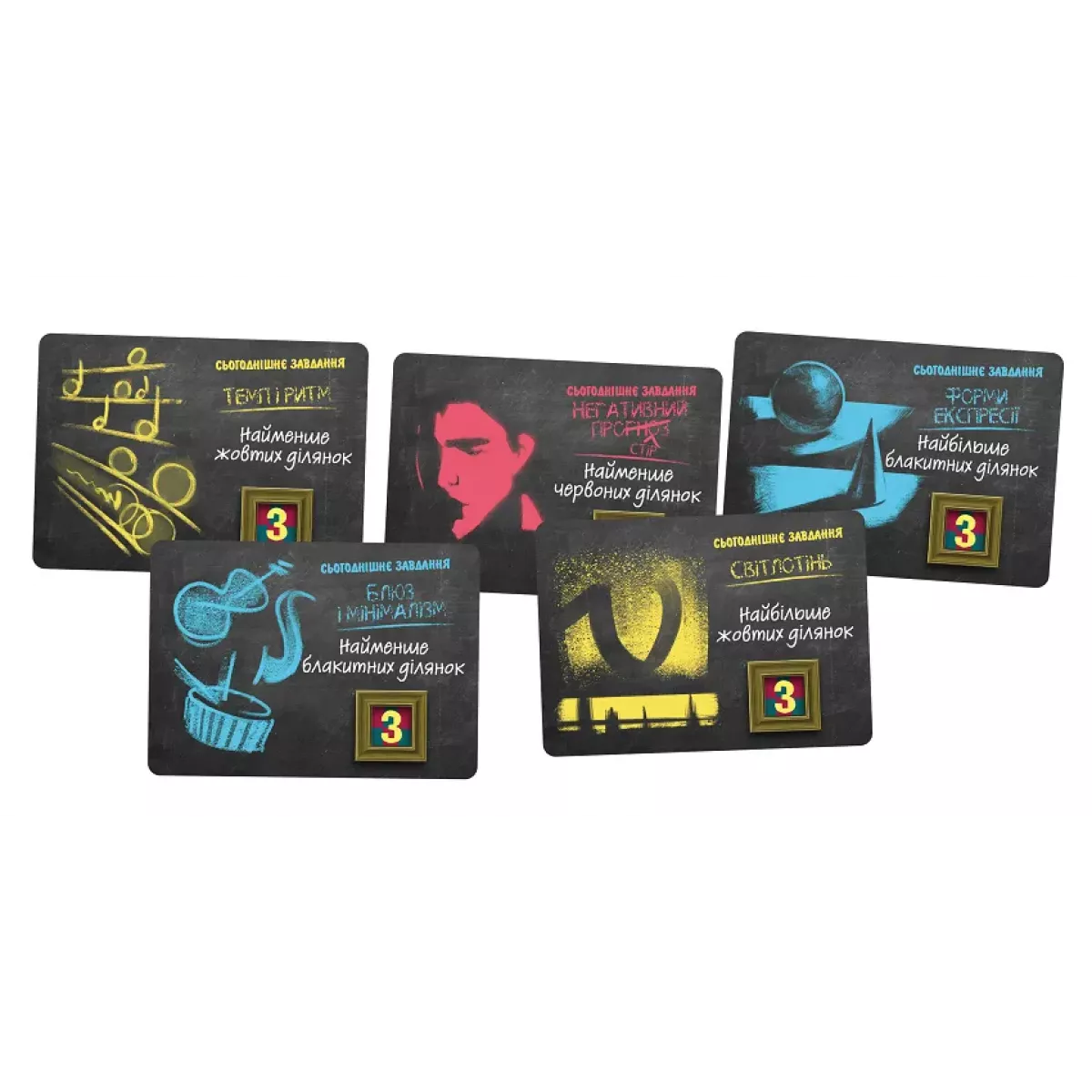 У коробці 1 карта улюбленця, 54 карти полотна, 8 карт професора, 12 карт натхнення, 5 карт синіх завдань, 5 карт червоних завдань, 5 карт жовтих завдань, 4 карти-пам’ятки, 1 книжка правил