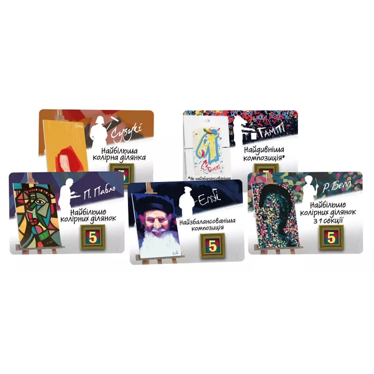 Приготуйтеся приміряти на себе образ студента художньої академії. Вам доведеться створювати абстрактні картини, сплітаючи між собою хитромудрі візерунки і наділяючи їх сенсом. Учасники Abstract Academy мають змагатися в креативі та творчих уміннях, оскільки лише кращі роботи здобудуть найвищі оцінки. Академія мистецтв (Abstract Academy) – стратегічна гра, для якої знадобиться натхнення. Доведеться також проявляти пильність, оскільки підступні опоненти заздрять вашому успіху і можуть спробувати зіпсувати полотно. Творіть абстракції, вражайте професорів та збирайте переможні очки, вписуючи своє ім’я в історію мистецтв. Пориньте у світ абстракції Гра розрахована на 2-4 особи, а одна партія може займати до 40 хвилин. На першому етапі потрібно відсортувати карти залежно від кольору сорочки, а потім роздати кожному з учасників по три карти полотна та одну карту натхнення. У того, хто ходить першим, буде знаходитись карта улюбленця, яка допомагатиме вирішувати неоднозначні моменти. Ігровий процес в Академії мистецтв поділено на три раунди: Теорія кольору – з кожної колоди кольорових завдань викладається по одній карті обличчям догори. Композиція – викладаються дві випадкові карти Професора. Фінальний проект – потрібно взяти карту Професора та дві випадкові карти кольорових завдань. Ходять гравці по черзі. Під час своєї черги потрібно розмістити картку полотна на полі та взяти додаткову картку полотна. На початку партії загальне поле може не мати конкретної форми, але обмежено форматом 4×4 чи 5×5 залежно від кількості учасників. Розміщувати карти можна лише по краях ряду. Потрібно заволодіти картами завдань, оскільки це допоможе визначити переможців. У випадку нічиєї карта улюбленця дозволить вирішити суперечку, інакше доведеться скинути завдання. Вибір найкращого художника Після трьох раундів іде підрахунок переможних очок. У процесі враховуються карти завдань та натхнення. Останні розігруються наприкінці раунду. Переможні очки приносить і карта Професора. У грі Академія мистецтв (Abstract Academy) багато простору для взаємодії, гра сповнена азарту та стратегічних рішень. У ній можна саботувати чужі плани, але також важливо продумувати кожен крок. Шанувальникам карткових ігор з простими правилами може сподобатися Ramen! Ramen!