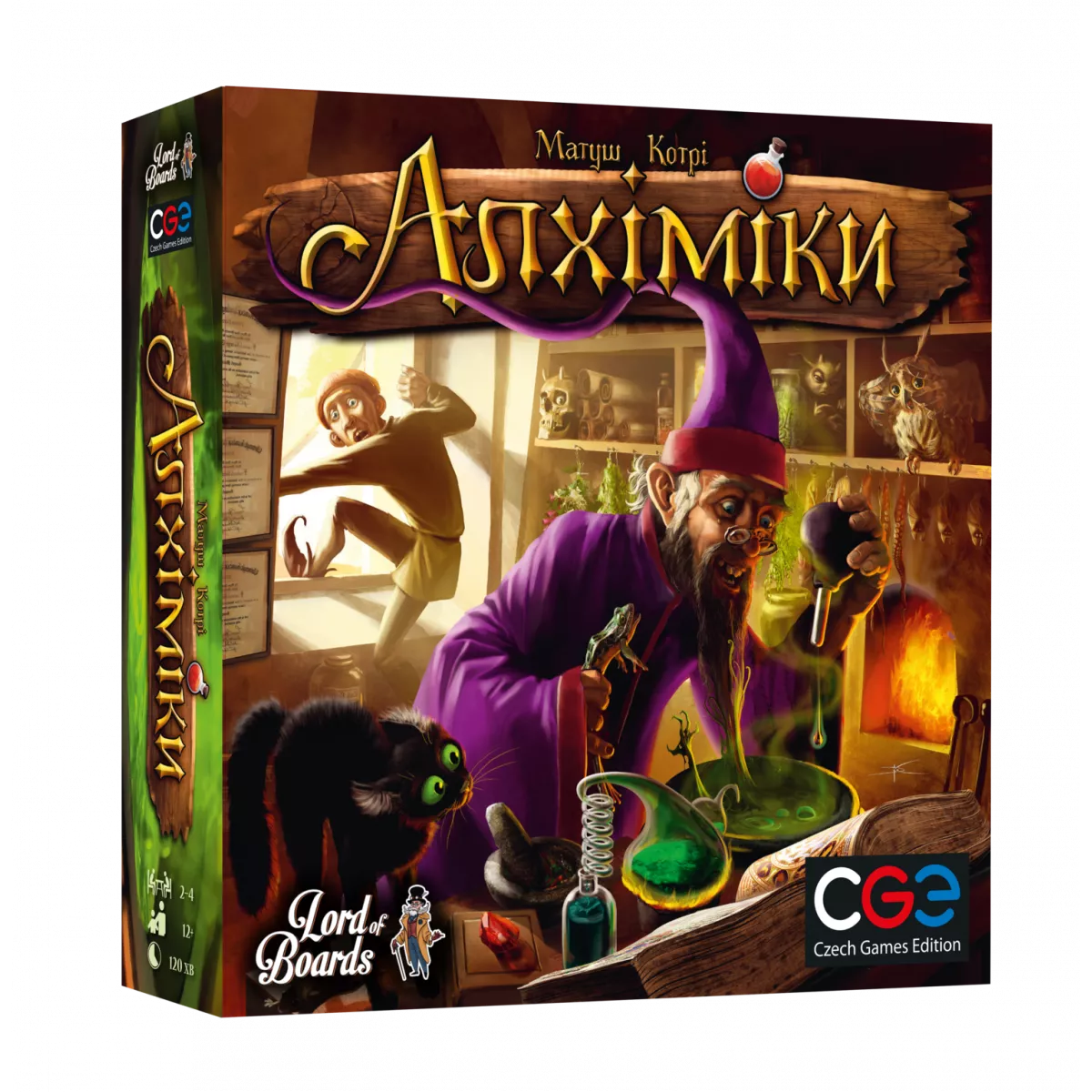 Бути вченим – дуже непросте завдання. Бути алхіміком – взагалі небезпечно. Бути вченим-алхіміком – азартно, ризиково, стратегічно, ще й логічне мислення необхідно підключати! Як утворився такий вибуховий коктейль, ви дізнаєтесь разом з друзями у єврогрі з елементами дедукції Алхіміки (Alchemists). Чарівний ковпак готовий? Жаб’ячі лапки вже замариновані? Мухомори висушені? Олів’є, який стоїть ще з нового року, вже перетворився у нову форму життя? Тоді саме час починати варити зілля! У чому ж полягає основна механіка гри? Кожен з алхіміків повинен визначити «структуру» інгредієнтів. Для цього використовують мобільний додаток (або спеціально навчену людину із планшетом комбінацій), вказують у додатку два інгредієнти, які зараз тушкуються у магічному казані, після чого додаток показує, яке зілля вийшло. І, з огляду на те, який колір (це виявити не складно, пляшечка ж скляна) та який ефект має зілля (тут вже складніше, адже на вареві чомусь не написано одразу, що воно робить, тому доведеться чи вмовляти сміливих студентів академії магічних наук скуштувати зілля, чи затиснути носа і хильнути його самому…), алхімік у власній лабораторії відмічає, з яких елементів складатимуться інгредієнти. Звичайно, за один раз усіх істин не дізнаєшся, тож потрібно експериментувати далі й далі! Аби лишень здоров’я у піддослідних вистачило… Алхімічна лабораторія - це взагалі окрема історія! Адже кожен вчений повинен десь зберігати свої записи, мати окремий куток для дослідів, а ще - вкрай необхідне місце для стільця, на який можна покласти мантію, якщо ліньки ховати її у шафу! Тому кожен з гравців має окрему ширму, за якою зберігатиме і свої золоті запаси, і проводитиме експерименти. Ніхто ж не хоче, аби про результати його досліджень стало відомо всім занадто рано! Але ж наука - це не лише досліди! Адже інгредієнти для зілля потрібно десь назбирати, ще й бажано - раніше за інших, аби колеги не витоптали найкращі галявинки, також потрібно купити додаткове обладнання, домовитись із крамарями за знижки на приворотне зілля, ще й можна дзвінку монетку заробити, продавши лицарю зілля для зупинки росту волосся у носі. Бути алхіміком - то складна й різнобічна робота, чи не так? То до чого все йде? Кожен вчений по суті своїй тяжіє до слави та престижу (які ще й переможними очками у грі будуть, яке співпадіння)! А заробити їх можна: висуваючи теорії про склад інгредієнтів, підтримуючи наукові матеріали колег, або ж спростовуючи теорії інших гравців. І, якщо після ряду раундів у вас буде найбільше престижу, то ви отримаєте звання Магістра Алхімії і чорного кота у подарунок (зверніть увагу, не йде в комплекті до гри!). Якщо ж ви готові до дослідів та вже роздмухуєте полум’я під казанком для варіння, хутчіш замовляйте коробочку з грою Алхіміки та доведіть іншим вченим, що саме ваші досягнення у зіллєварінні вартують того, аби їх зазначали у шкільній програмі Академії Алхімії! У випадку, якщо наука вас не приваблює, але до зіллячок ви маєте хист, - зверніть увагу на швидку гру Відьомська Круговерть, у якій ви зможете влаштовувати капості своїм сусідкам-відьмочкам, підкидаючи до їх казанів зовсім не те, що вони хотіли б там бачити…