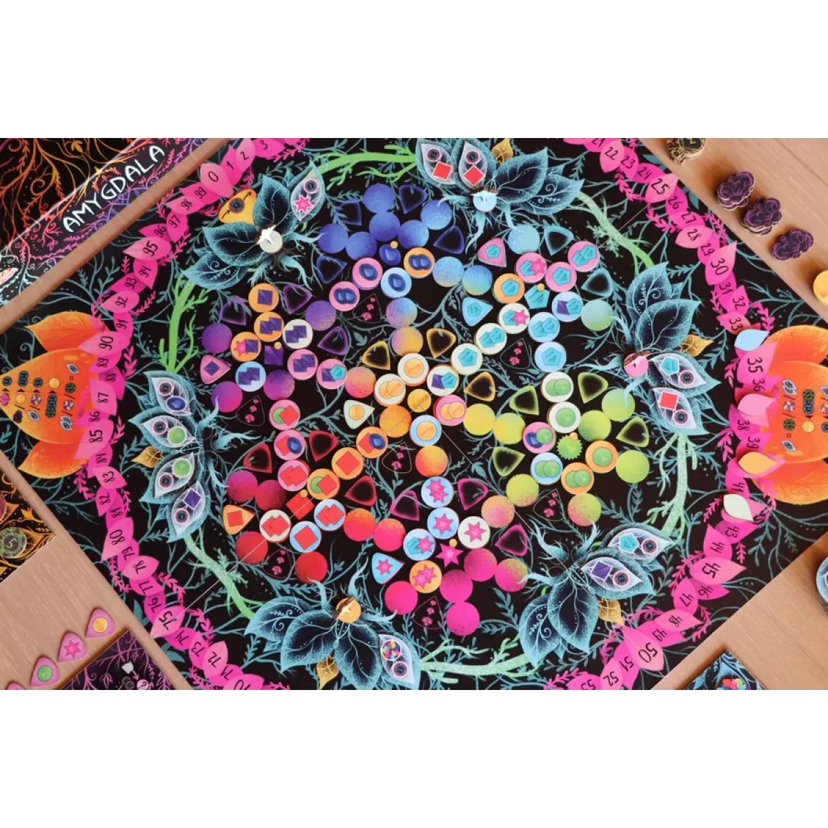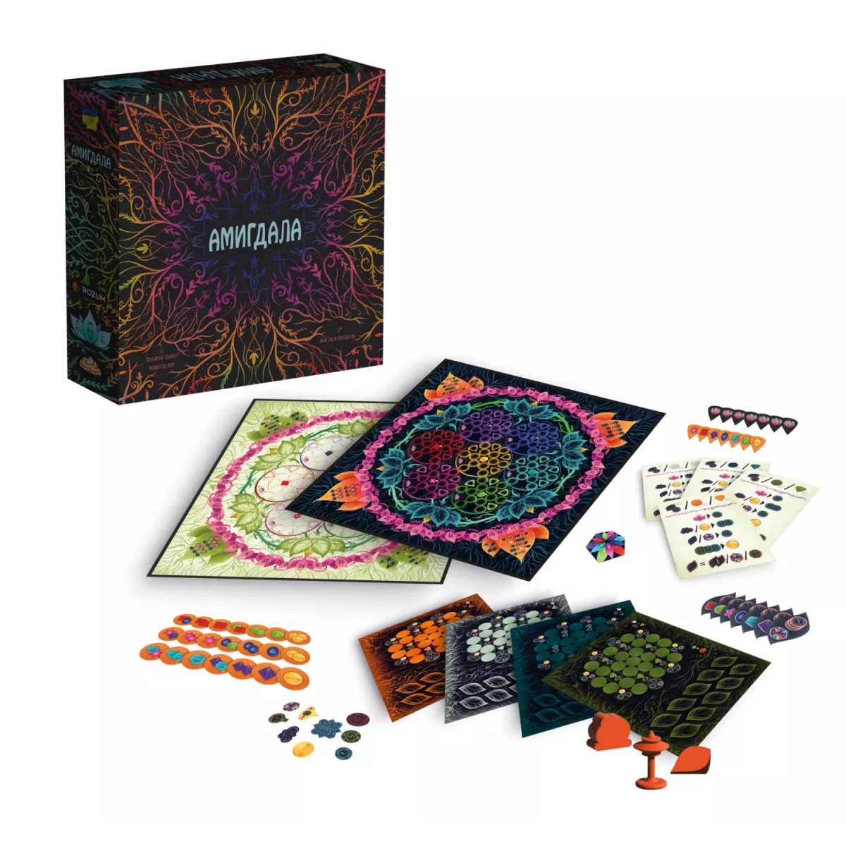 За день людина переживає увесь спектр емоцій, неможливо сказати, що хтось весь час був веселий, або весь час сумний. У нас в голові змішуються думки, мрії, плани, переживання та радість, утворюючи цілий калейдоскоп почуттів. А у мальовничій абстрактній грі Amygdala від 2 до 4 гравців намагатимуться упорядкувати всі думки і створити у собі повну гармонію всіх почуттів. Все-все в голові не утримаєш, щось та й забудеться Кожен гравець отримує на початку гри власний планшет з емоціями та банком пам’яті. Емоції необхідно «придбати» за спеціальні ресурси, аби потім розмістити їх на одному з семи дисків спільного мальовничого поля, що символізує людський розум. Ресурси ж для емоцій можна отримати, заплативши за них монетки, та сховавши у себе у пам’яті. І от з пам’яттю кояться найцікавіші пригоди, адже ви маєте всього 10 комірок, у кожній з яких може міститися лиш один об’єкт. І якщо утримувати там один жетон ресурсу не складно, або 10 монет одним жетоном лежать дуже зручно, то 4 монетки займатимуть 4 місця, а якщо ви захочете зберегти у пам’яті мрії (чим їх буде більше одночасно, аж до 6, тим більше переможних очок можна отримати) то доведеться навіть жертвувати чимось іншим. Як зібрати емоції так, щоб бути щасливим? Викладаючи на поле емоції ви завоюєте вплив на певні ділянки мозку. Якщо ваших жетонів на ділянці буде найбільше – то ви отримаєте переможні очки за цю ділянку… За ще однієї умови: туди треба розмістити ще й маркер контролю. Без нього переможні очки, навіть якщо їх планувалося дуже багато, перетворюються лише у нездійсненні плани. І впродовж всієї гри вам треба слідкувати за власним банком пам’яті, обирати, на які ресурси витратити монети, за ці ресурси придбати емоції, маркери контролю та мрії, а ще й жетони щастя можна отримати лише як бонус за інші виконані дії. До того ж можна і правила модифікувати, ускладнюючи чи спрощуючи гру… Звучить складно? Насправді все не так, гра Amygdala комплексна і різноманітна, але не складна.  Вже після першої партії ви відчуєте захоплення від різноманітних тактик, варіативності планів, фонтану кольорів і забудете про складність правил, залишиться лише насолода від гри. Тож емоції, що подарує ця абстрактна настілочка точно вартують того, аби додати її собі у колекцію! І якщо вам подобаються мальовничі абстрактні стртегії, зверніть увагу на красу реального світу, до прикладу, серед мальовничих рифів у глибині океану у грі AQUA. Океанське різноманіття.