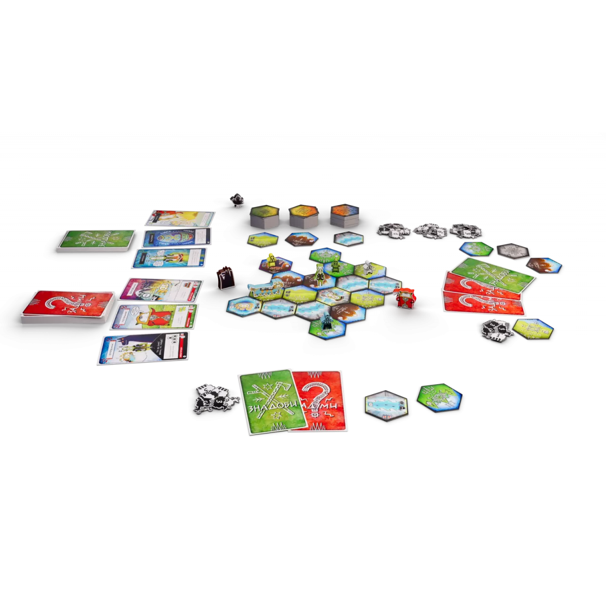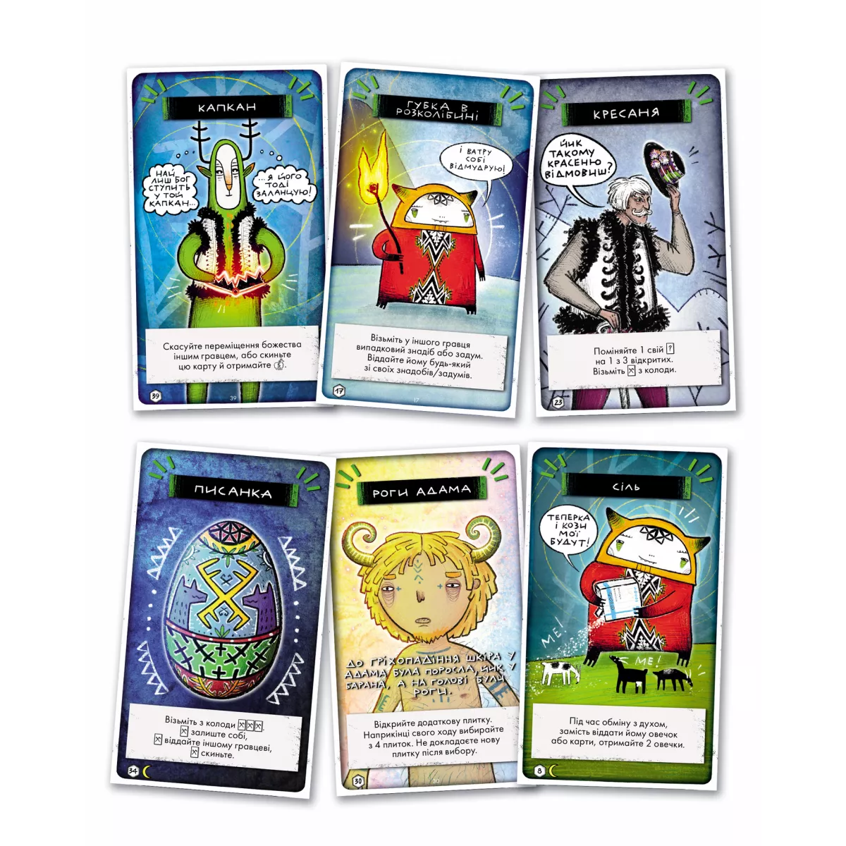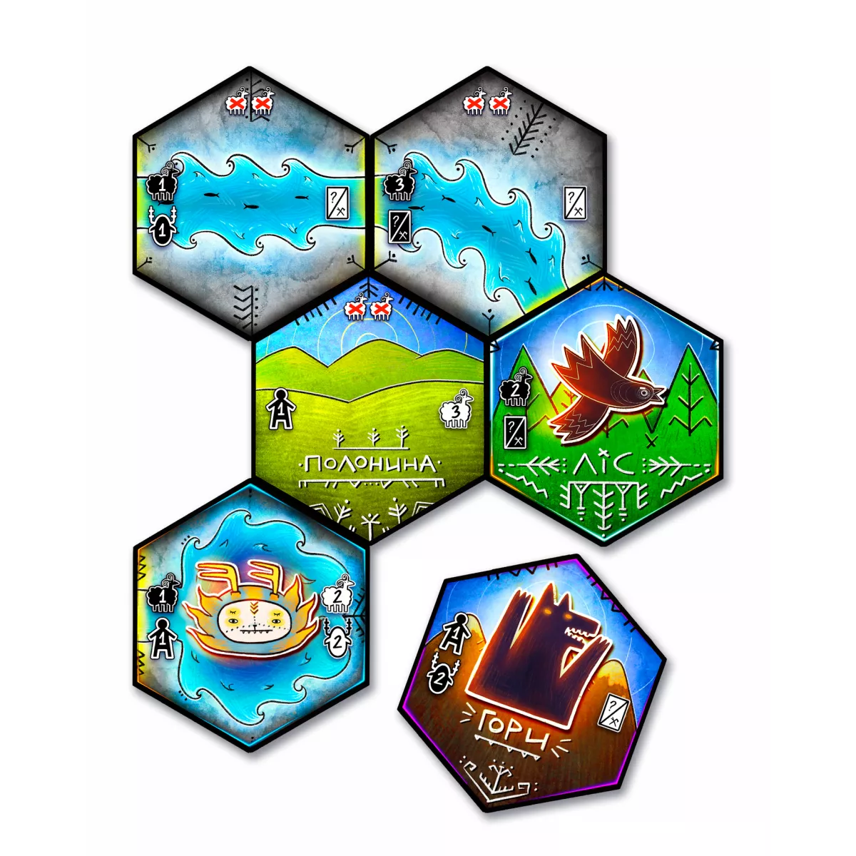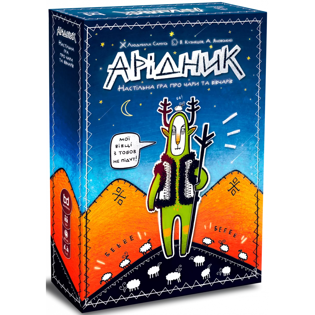 У коробці 45 плиток місцевості, 52 карти задумів, 40 карт знадобів, 8 карт персонажів, 4 карти-пам’ятки, 4 фігурки вівчарів, 5 фігурок духів, 80 жетонів овечок, Книжка правил, Книга історій, Правила сімейної гри