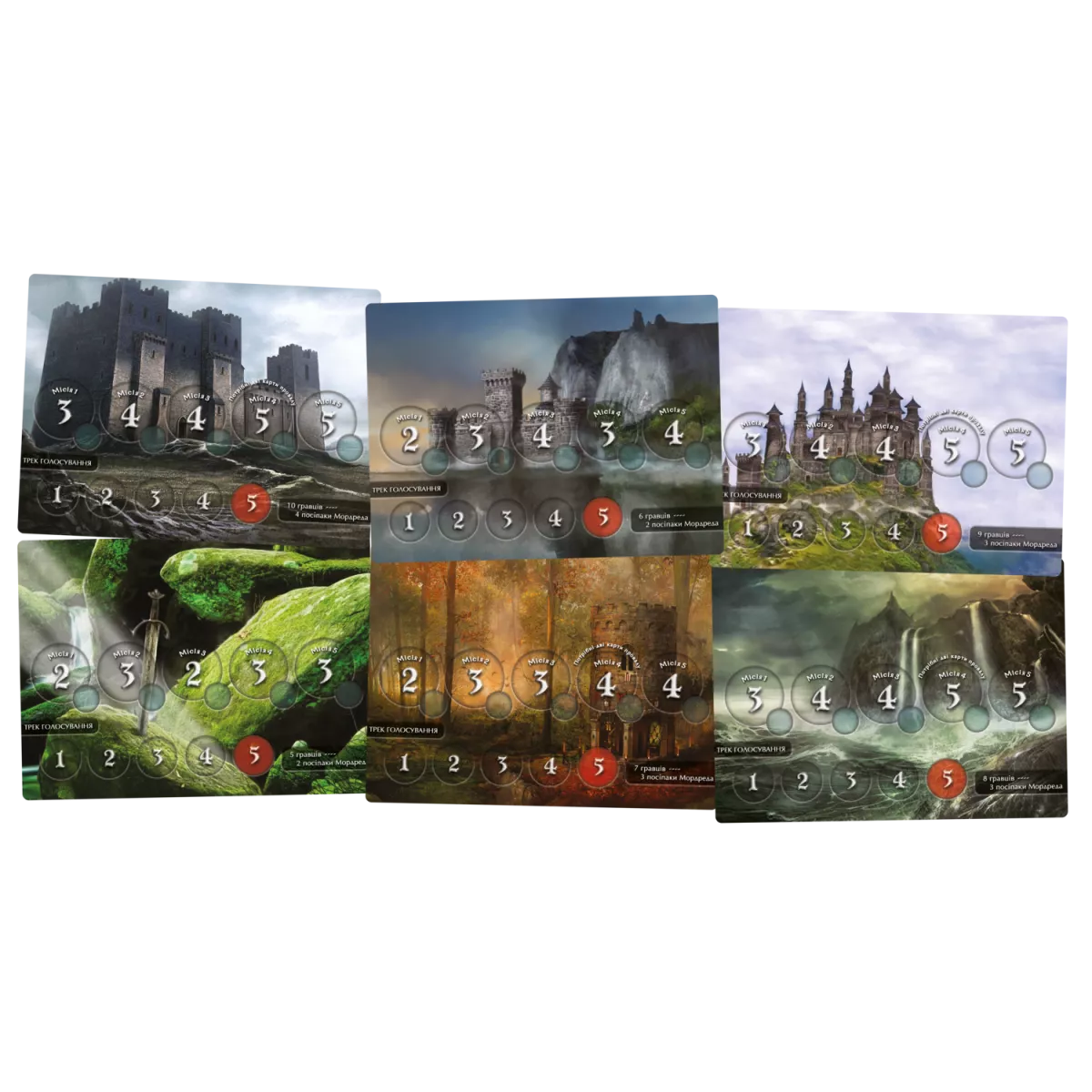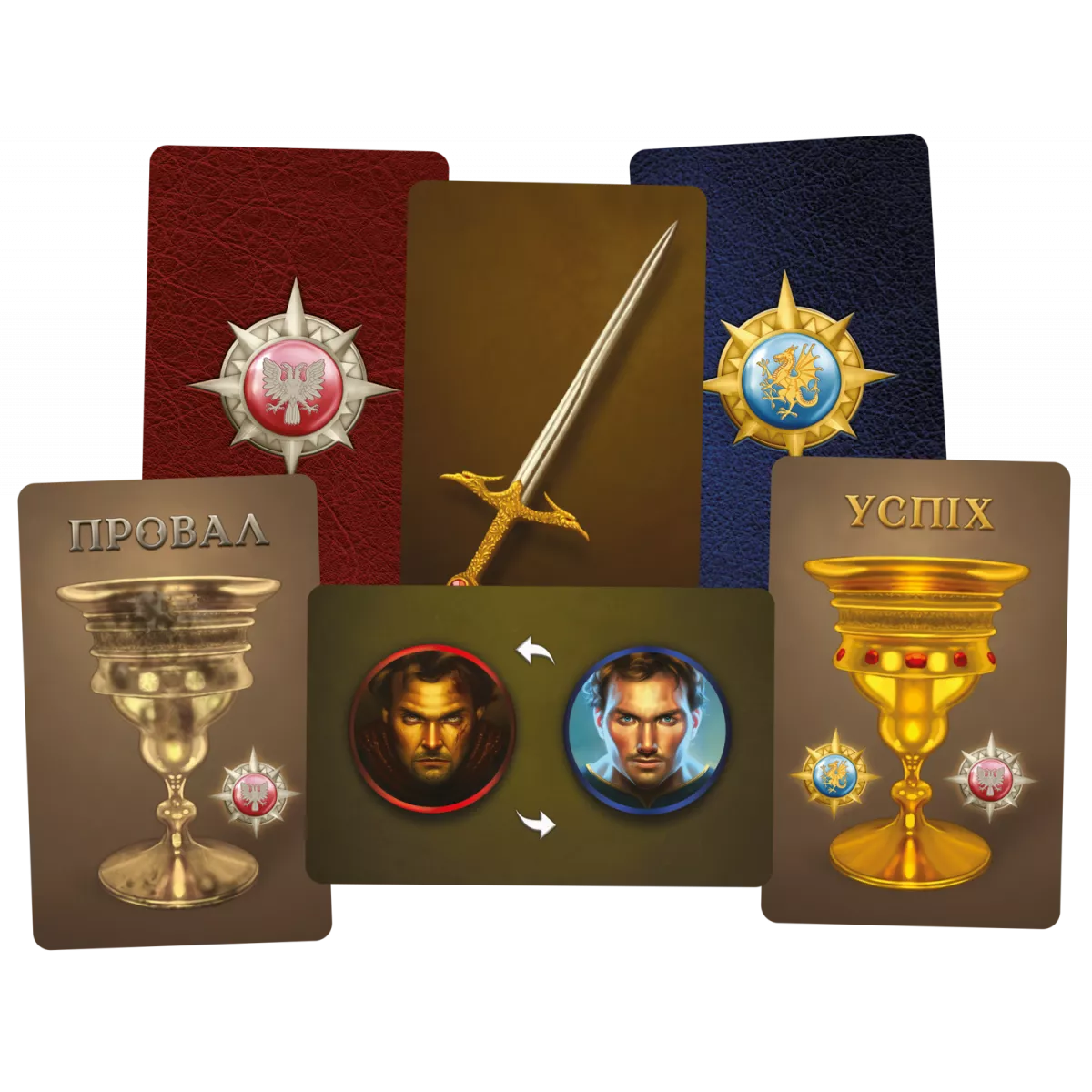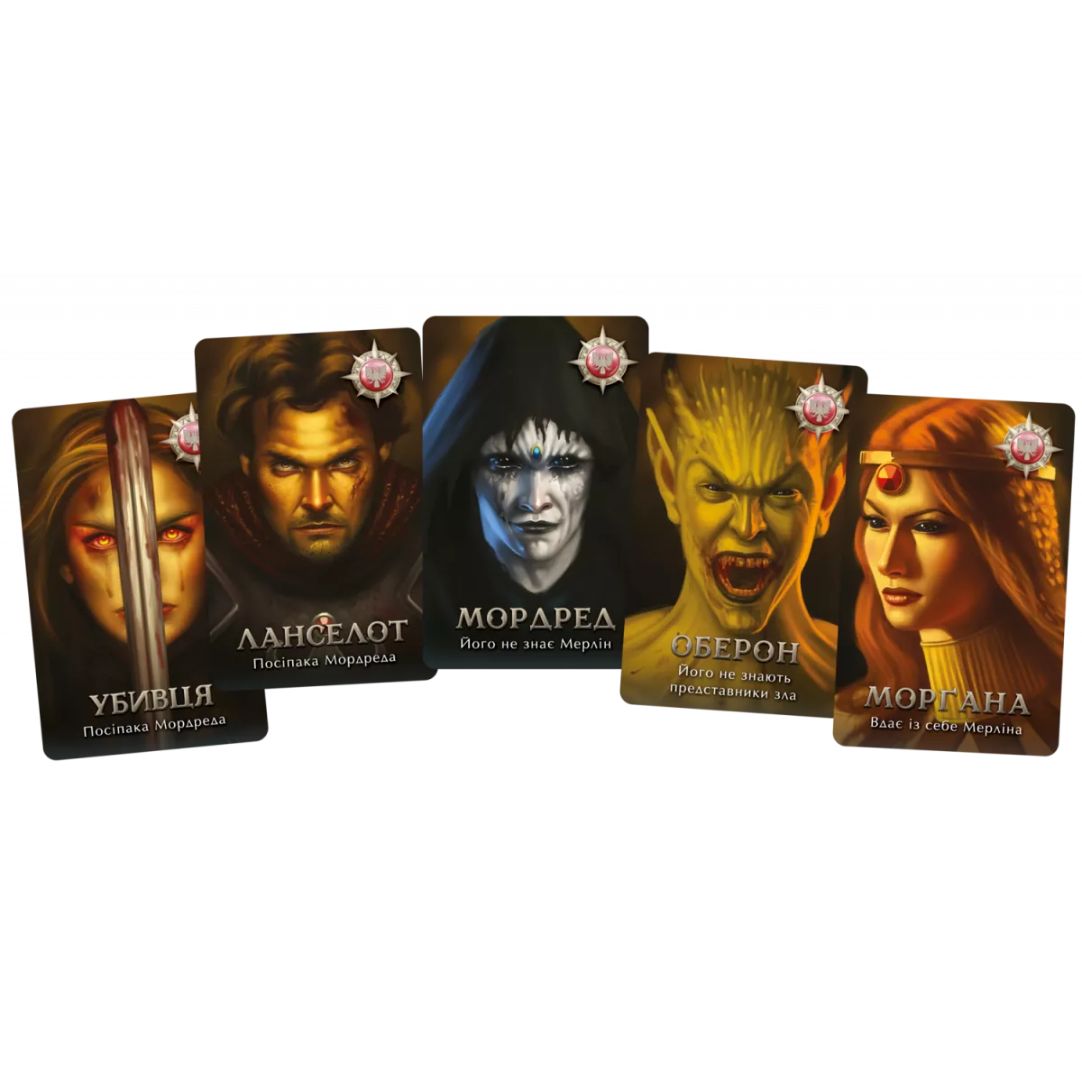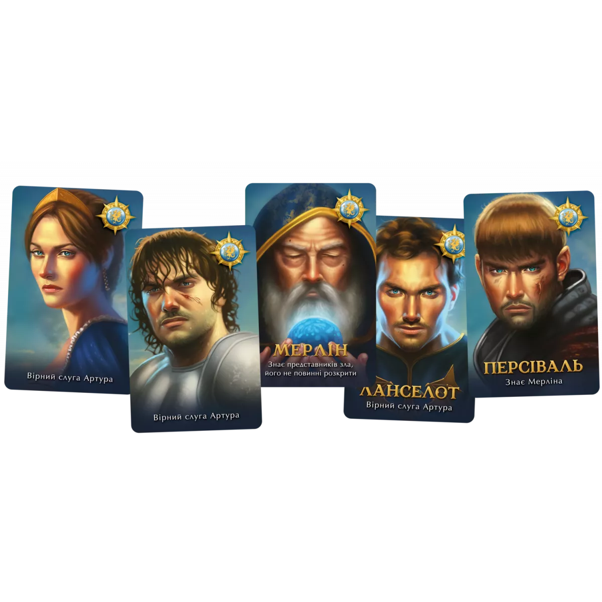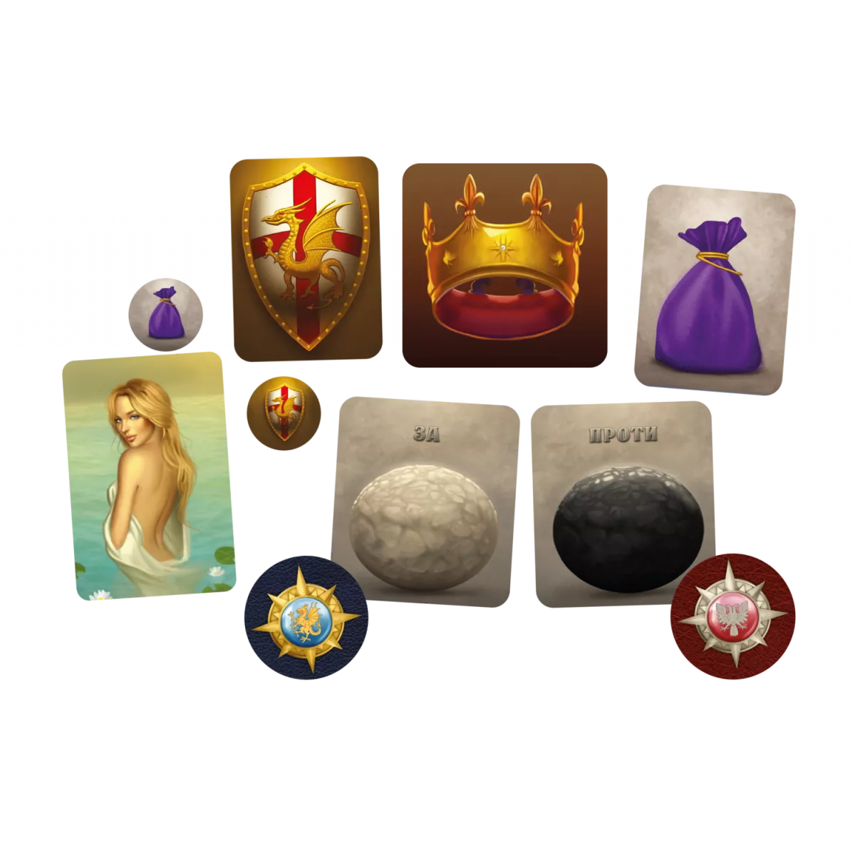 У коробці 14 карт персонажів, 10 карт місій, 5 жетонів загону, 20 жетонів голосування, 5 двосторонніх маркерів результату, 1 маркер раунду, 1 маркер голосування, 1 жетон лідера, 3 двосторонні планшети, 2 карти лояльності, 1 жетон Володарки озера, 1 карта Екскалібура, 2 карти Ланселота, 7 карт вірності, правила гри