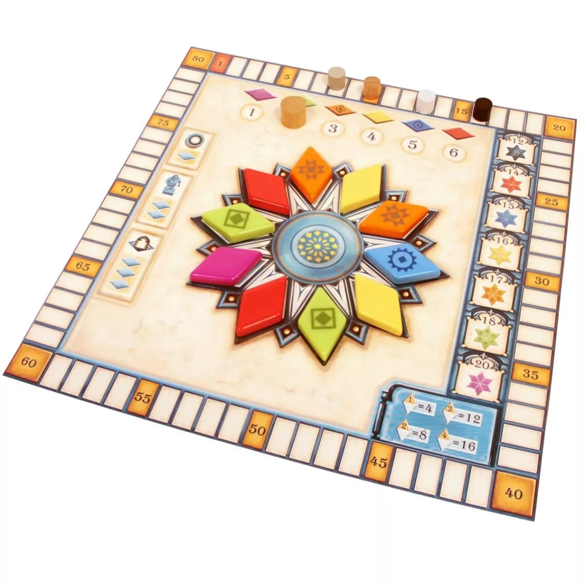 Частиною чарівності Azul є плитка. Цього разу вони чудові у формі ромба, які ви використовуєте для створення квіткових візерунків. Складання креслень, механізм вибору плитки з відкритого вибору, виконується простим способом. Щоб встановити кілька картонних підставок (технічно фабрики, але вони виглядають як підставки!) залежно від кількості гравців. На початку раунду на ці підставки кладуть чотири випадкові плитки. У свій хід ви берете плитки з одного з підстаканників, якщо всі вони одного кольору. Залишені плитки виштовхуються з підстаканника в середину. Щойно посередині є плитки, гравці можуть брати звідти.