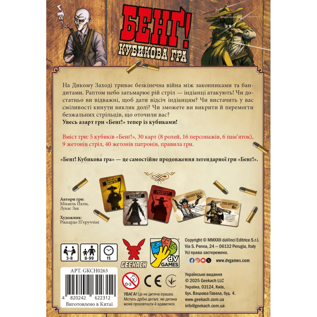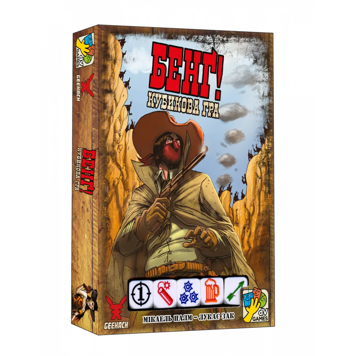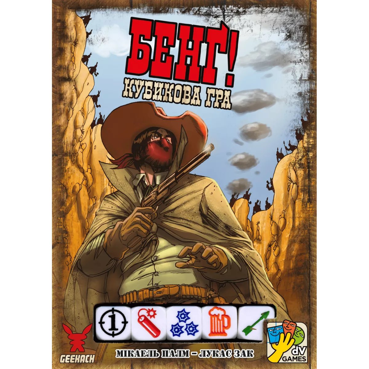 «Бенґ! Кубикова гра» — нова версія культової гри-перестрілки «Бенґ!», яка занурює гравців у небезпечні розбірки Дикого Заходу. Знайомі ролі та персонажі, але тепер долю міста вирішує жменя кубиків. Азарт, непередбачуваність і напруга — ось що чекає вас у цій захопливій кубиковій перестрілці!