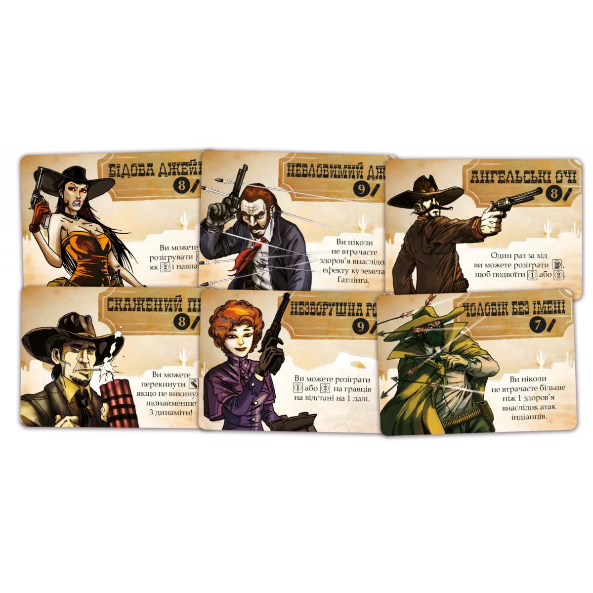 Ґатлінг. Якщо ваша комбінація налічує щонайменше три такі символи, кулемет Ґатлінга вражає всіх гравців, крім вас, на 1 очко здоров’я. Ви скидаєте всі свої жетони стріл.