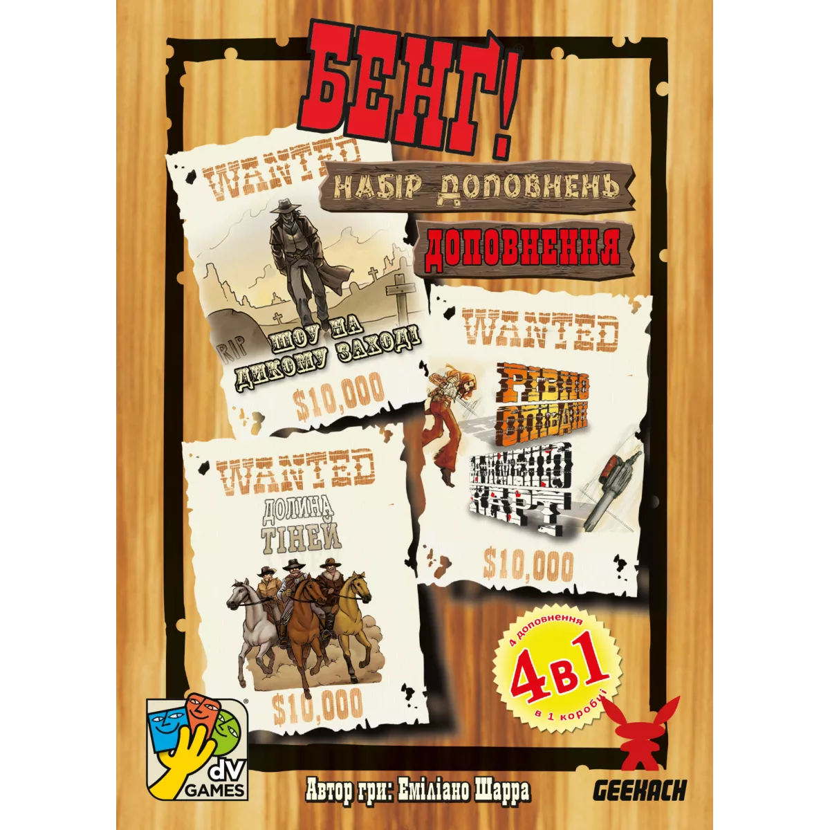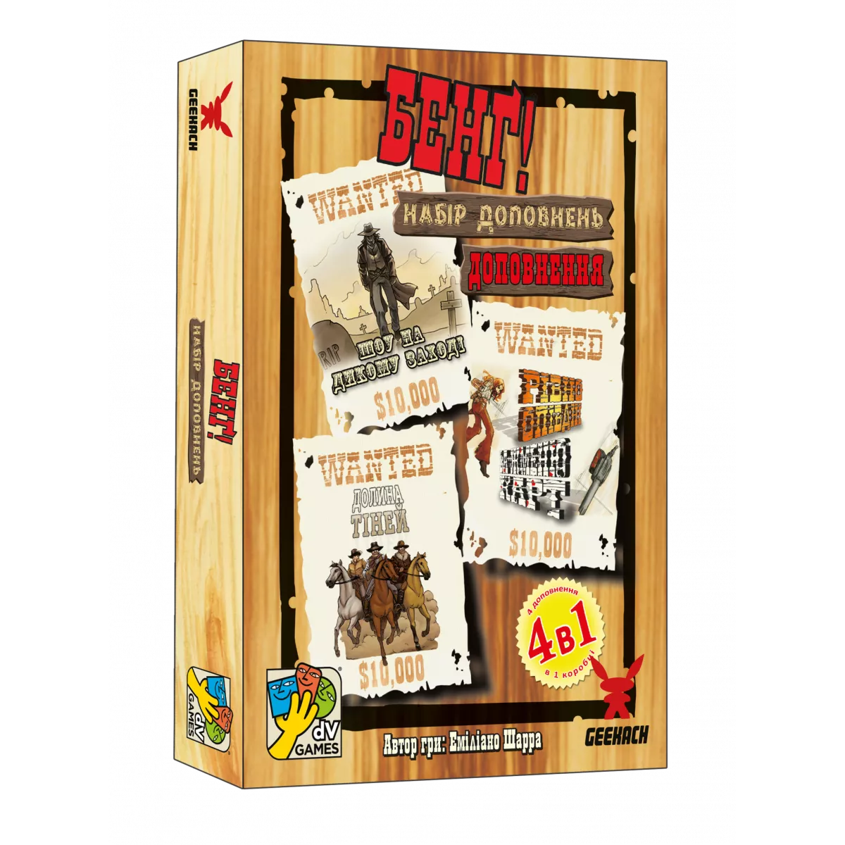 «Бенґ! Набір доповнень» — комплект із чотирьох доповнень до компанійського вестерна «Бенґ!». Нові персонажі, події та додаткові механіки, які зроблять гру глибшою, а перестрілки — ще напруженішими. Набір особливо сподобається тим, хто вже добре знайомий із правилами та шукає нових викликів.