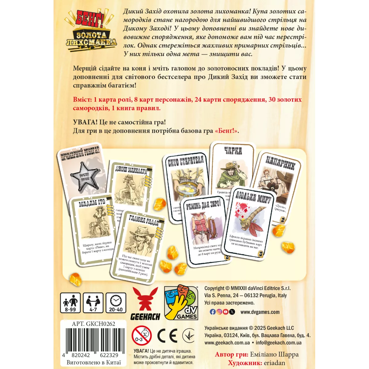 «Бенґ! Золота лихоманка» — доповнення до карткової гри-перестрілки в стилі спагеті-вестернів «Бенґ!». Влучність тепер приносить не лише виживання, а й золоті самородки. Кожна влучна куля дзвенить золотом, що дасть змогу придбати нове спорядження в місцевій крамниці. І навіть смерть не зупинить спраглих помсти!
