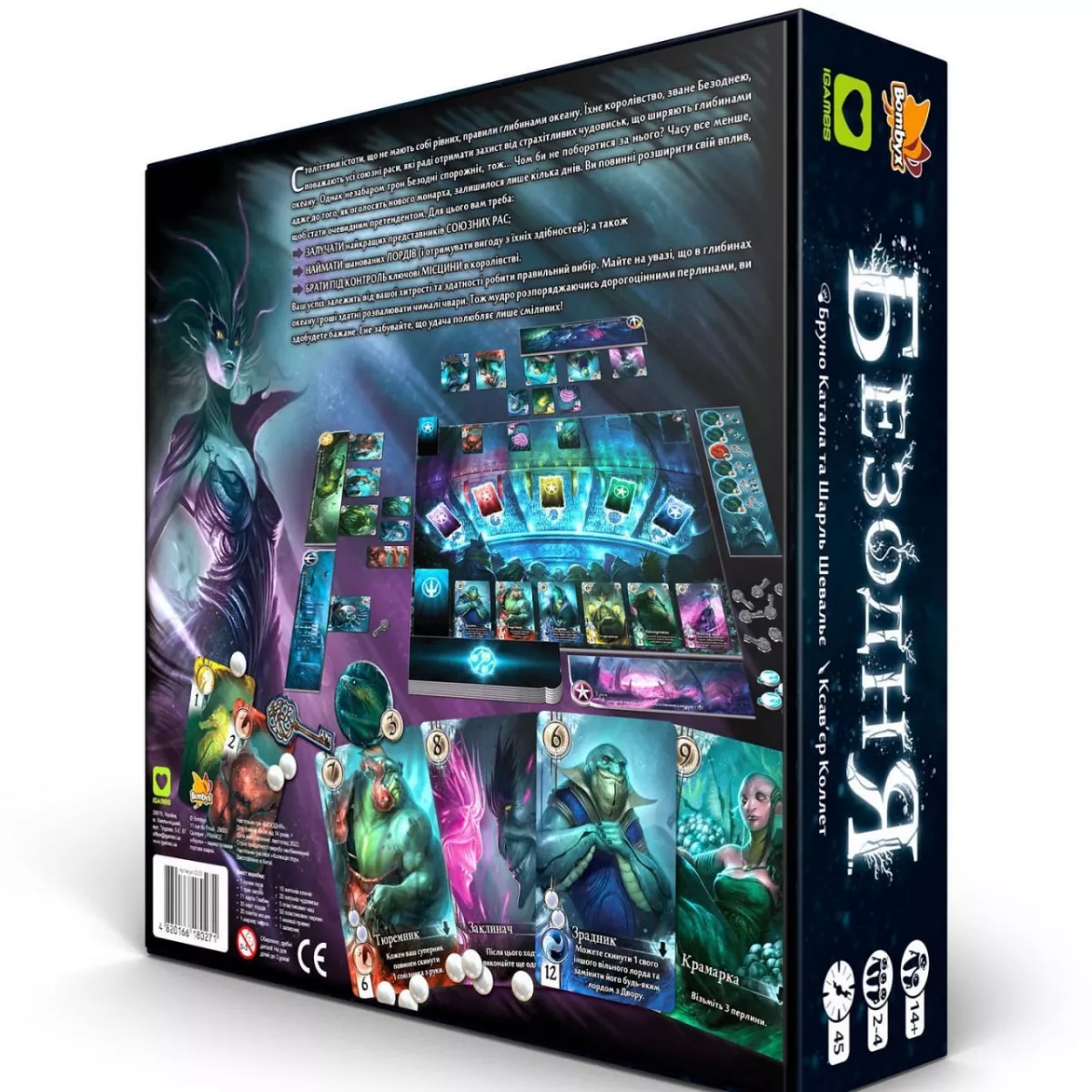 П'ять каст, Кіклади, Доміношне королівство, 7 Чудес Дуєль - настільні ігри з характерним смаком талановитого і одного з найплідніших авторів сьогодення Бруно Катала. Якщо ви вже встигли захопитися цими витворами, то маєте неодмінно спробувати й не менш відому гру Безодня (Abyss). Безодня (Abyss) - це настільна гра на розвиток, комбінування та збір сетів, у якій гравці намагаються взяти під контроль стратегічні локації в підводному місті. Нескладні правила, відсутність прямого конфлікту, трохи фарту та неймовірно красивий дизайн. Безодня (Abyss) – це настільна гра про боротьбу за владу у темному й неспокійному підводному царстві, у якій ви зможете відчути себе справжнім претендентом на престол. Укладайте угоди, порушуйте їх, запевнюйте силою чи маніпулюйте і хитруйте, робіть все, аби отримати найбільший вплив у різних локаціях підводної столиці. Безодня знову без володаря і місце знову вакантне, тож саме час вибороти трон і його привілеї. Використовуйте всю свою кмітливість, щоб виграти або купити голоси в Раді, використовуйте Союзників, наймайте найвпливовіших Лордів, зловживайте їхніми повноваженнями, робіть усе можливе, аби захопити контроль над стратегічними територіями. Нарешті, доведіть усім, що ви - єдиний, хто здатний керувати народом Безодні! Та перш, ніж заволодіти стратегічною локацією, кожен бажаючий має пройти неабиякий шлях, досліджуючи глибини самої Безодні. Сині Кальмари, жовті Морські коники, зелені Молюски, червоні Краби і фіолетові Медузи, п'ять рас союзників і монстрів, перли і заповітні ключі... Битися чи продовжити дослідження?