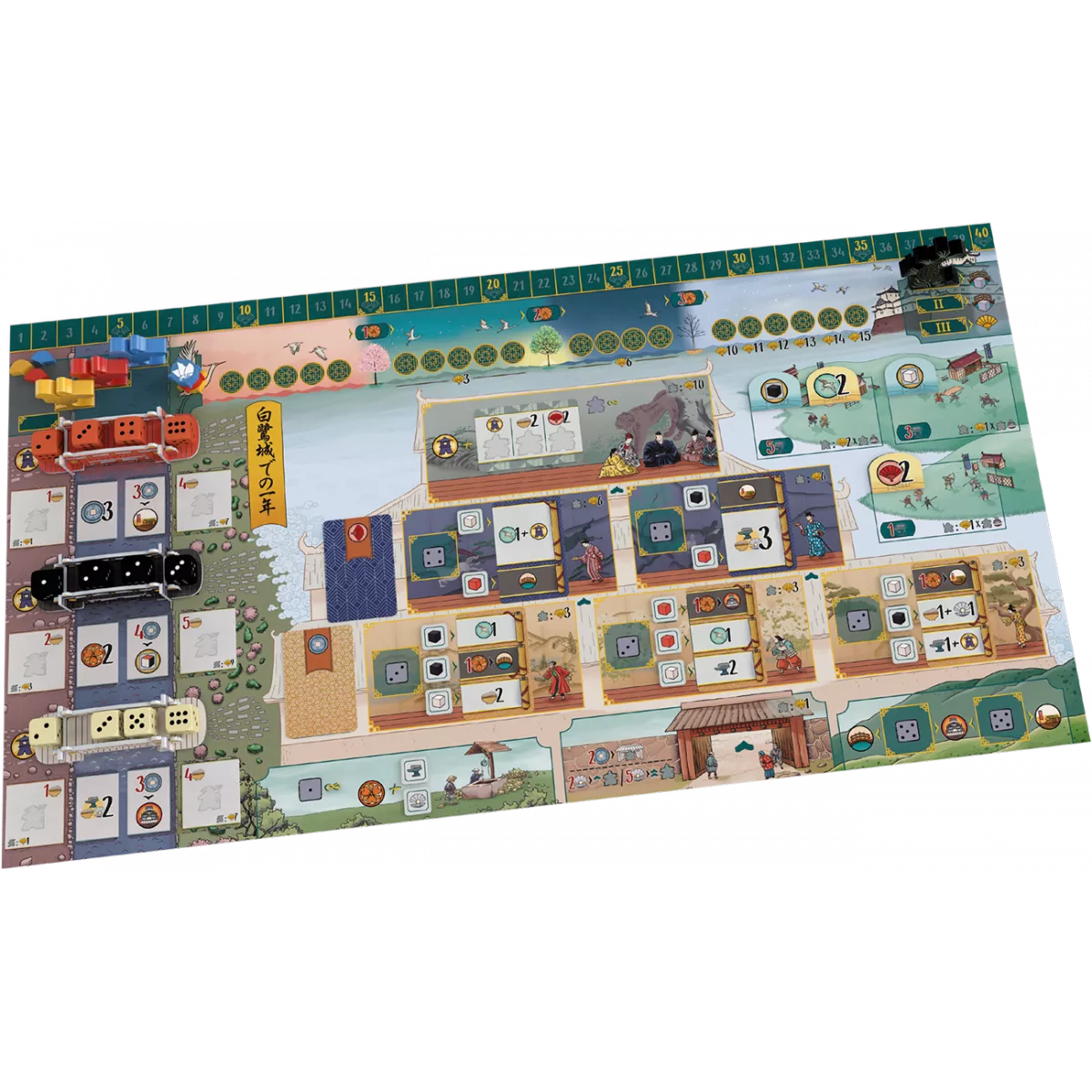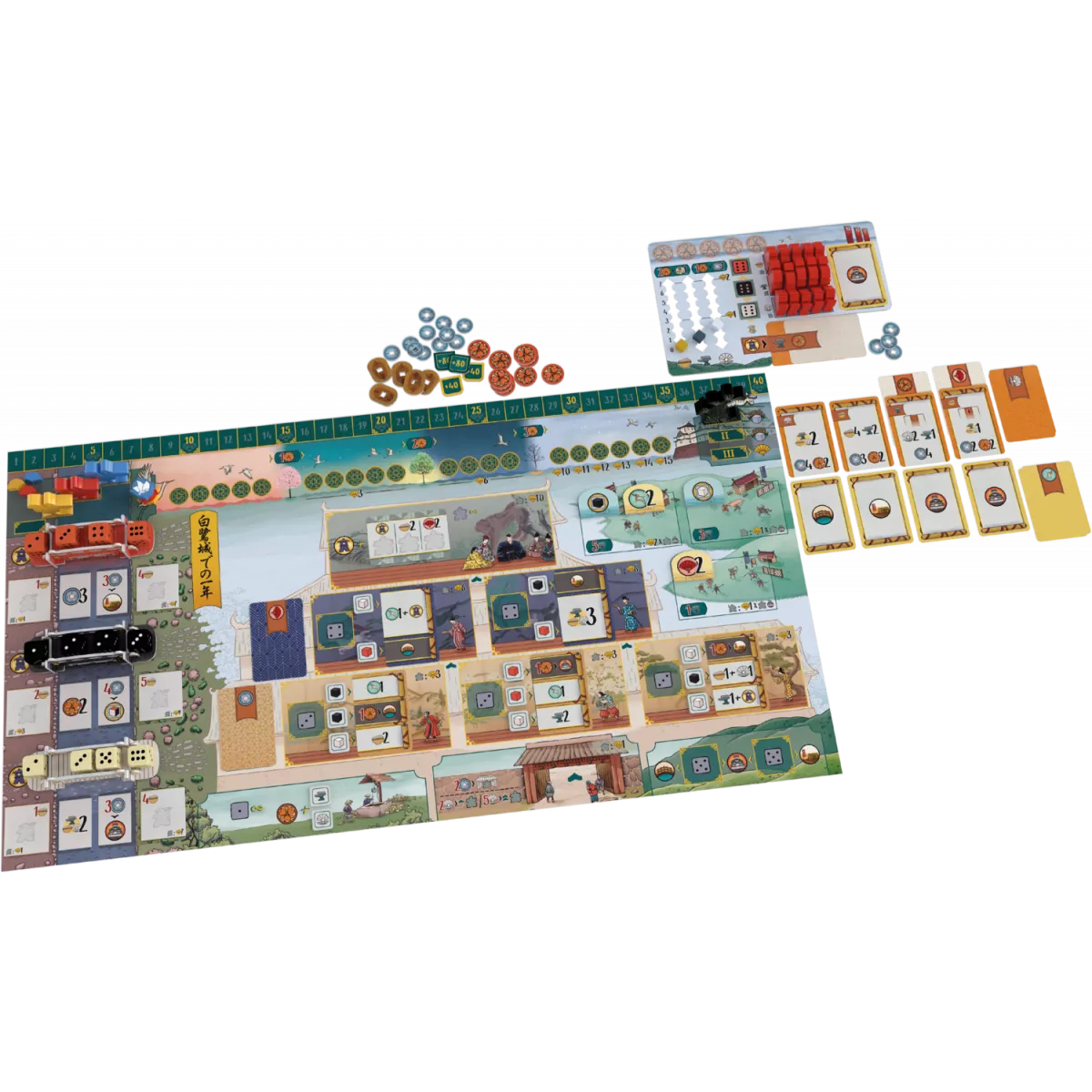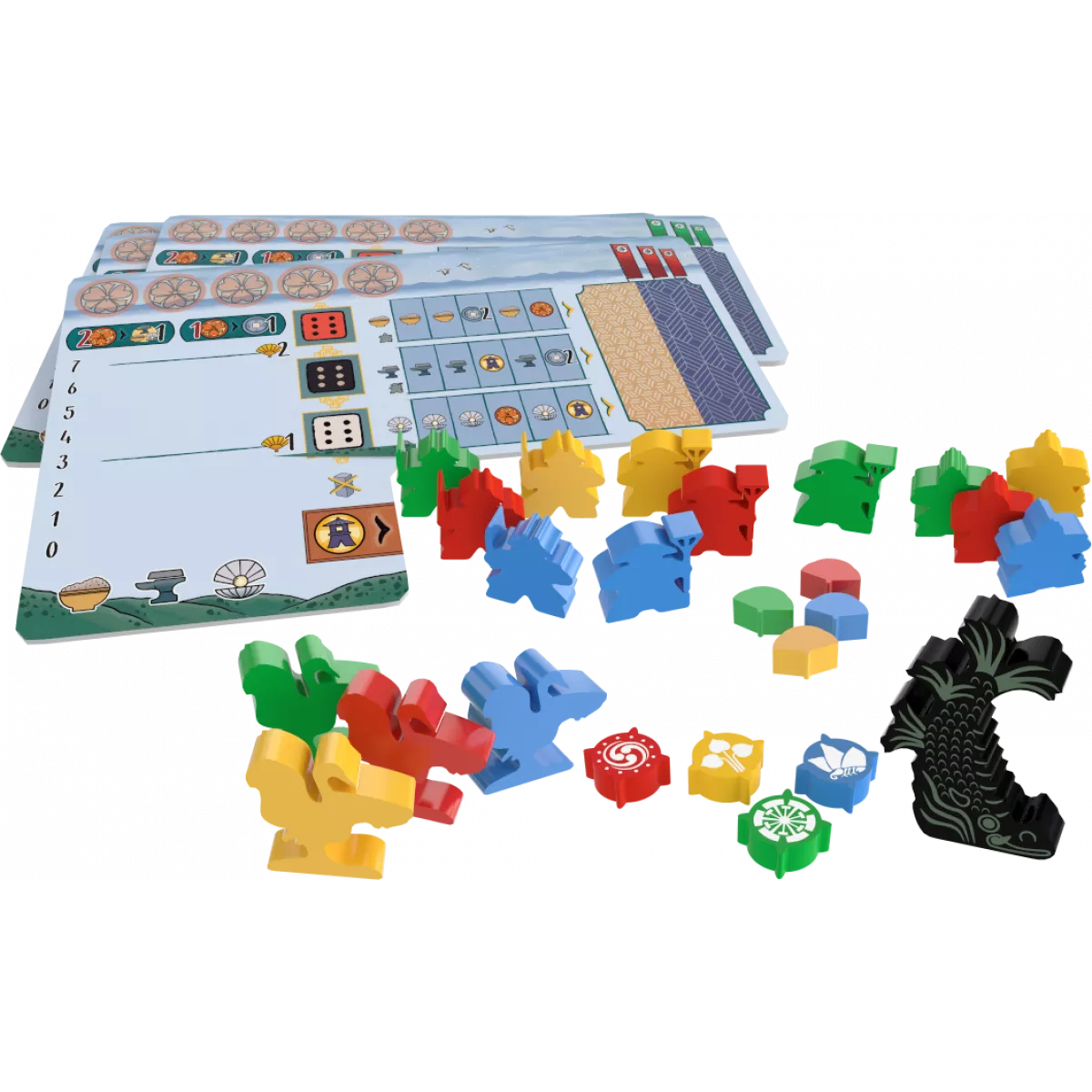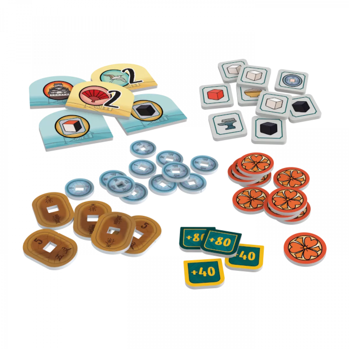 У коробці 1 головне поле;, 4 планшети особистих володінь;, 3 мости;, 15 кубиків;, 8 плиток майданчиків;, 1 маркер раунду;, 12 маркерів ресурсів;, 4 фішки чапель;, 15 плиток кубиків;, 20 печаток даймьо;, 32 монети;, 4 маркери впливу;, 4 фішки віял;, 20 фішок придворних;, 20 фішок воїнів;, 20 фішок садівників;, 6 карток стартової дії;, 9 карток стартових ресурсів;, 3 картки указу;, 15 карток розпорядника;, 12 карток дипломата;, 9 карток даймьо;, 5 карток саду рослин;, 5 карток саду каменів;, 9 карток одиночного режиму;, 4 картки-пам’ятки;, правила.