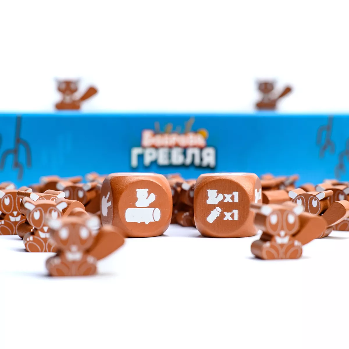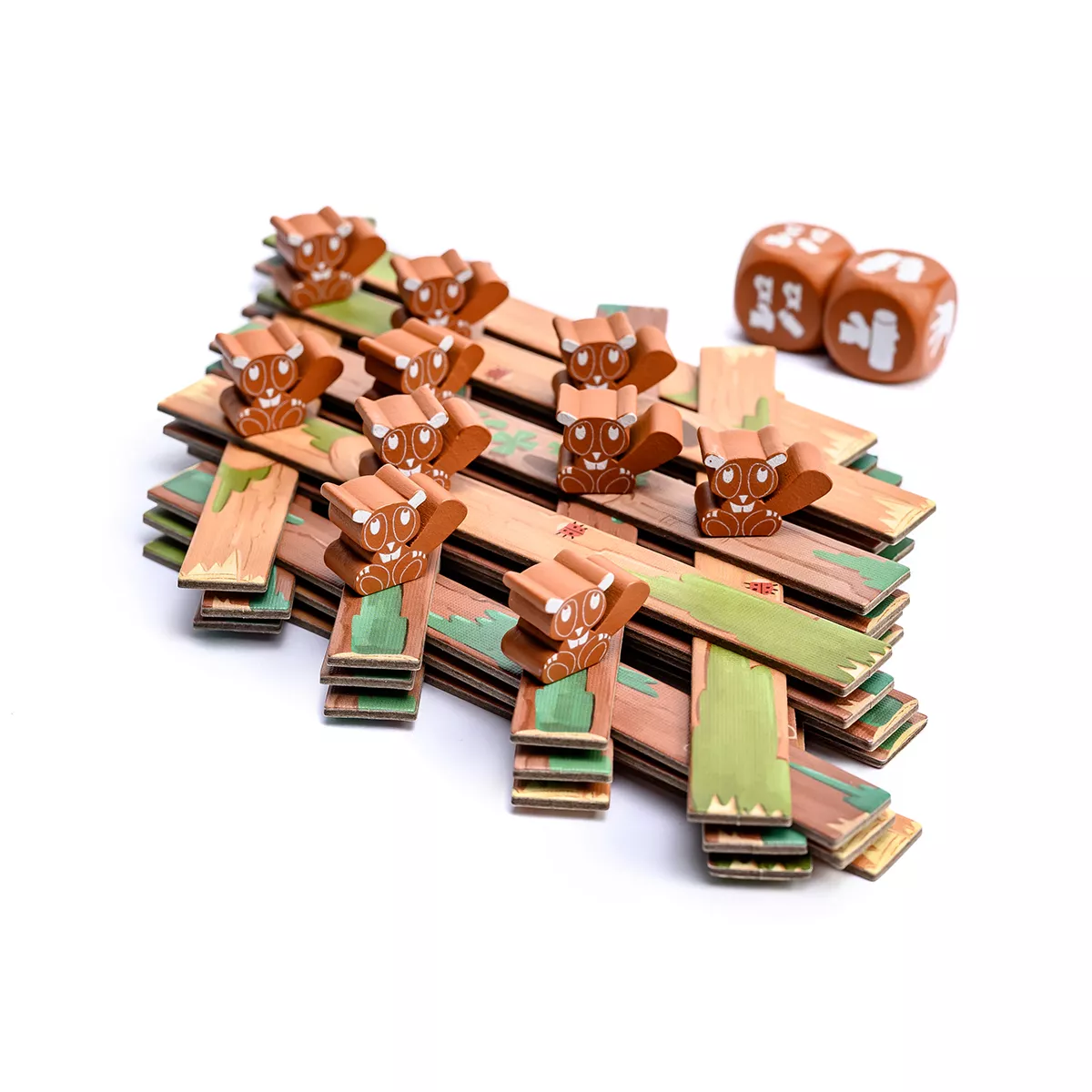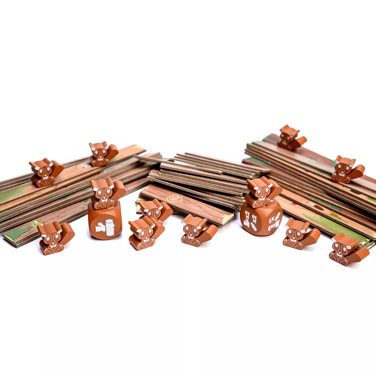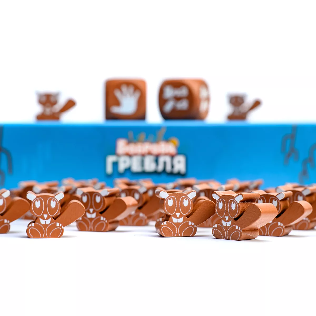 У коробці 2 дерев'яні кубики, 50 брусків (30 довгих і 20 коротких), 30 фішок бобрів, правила гри