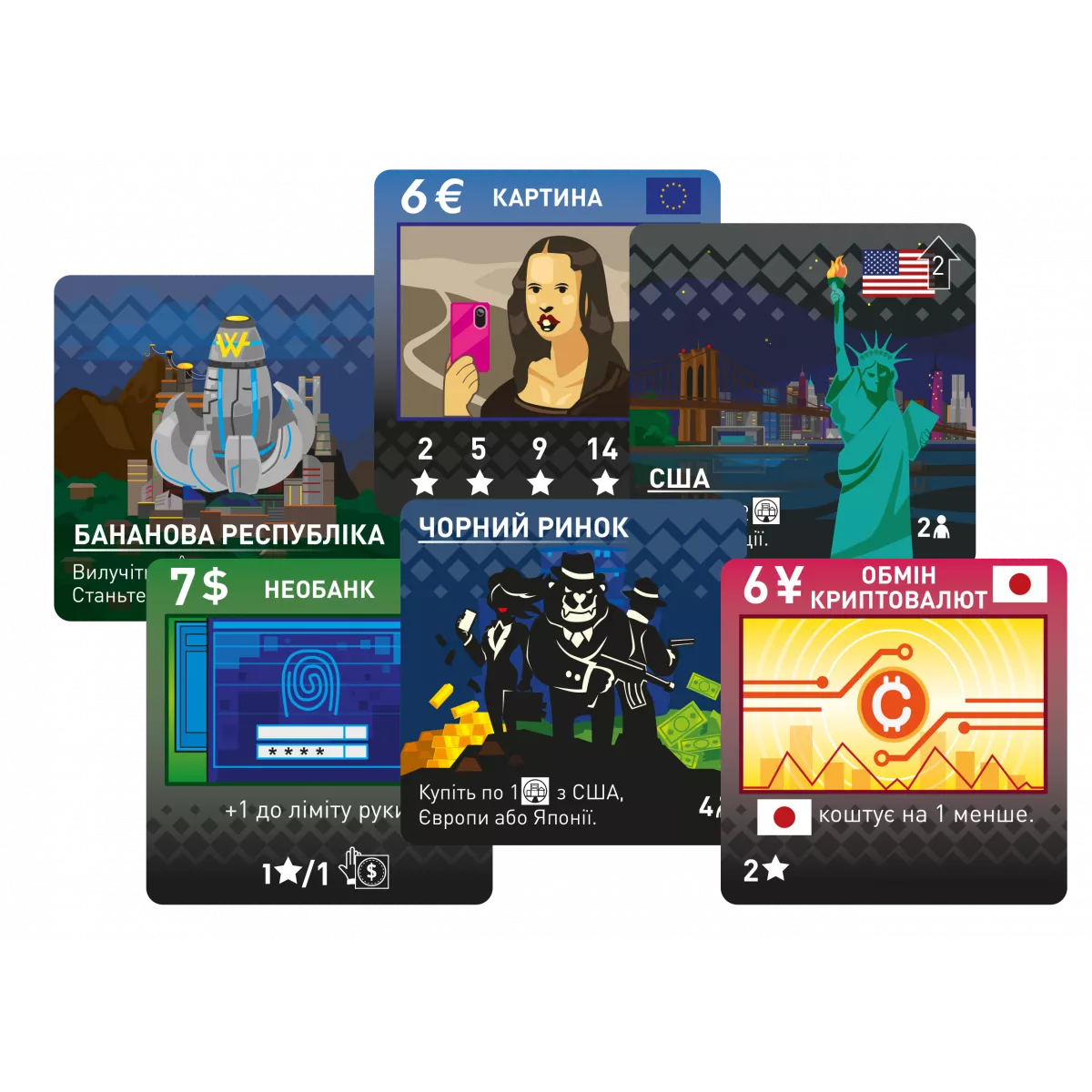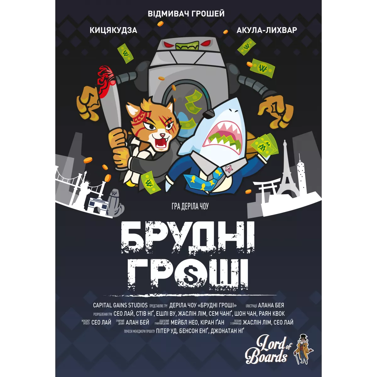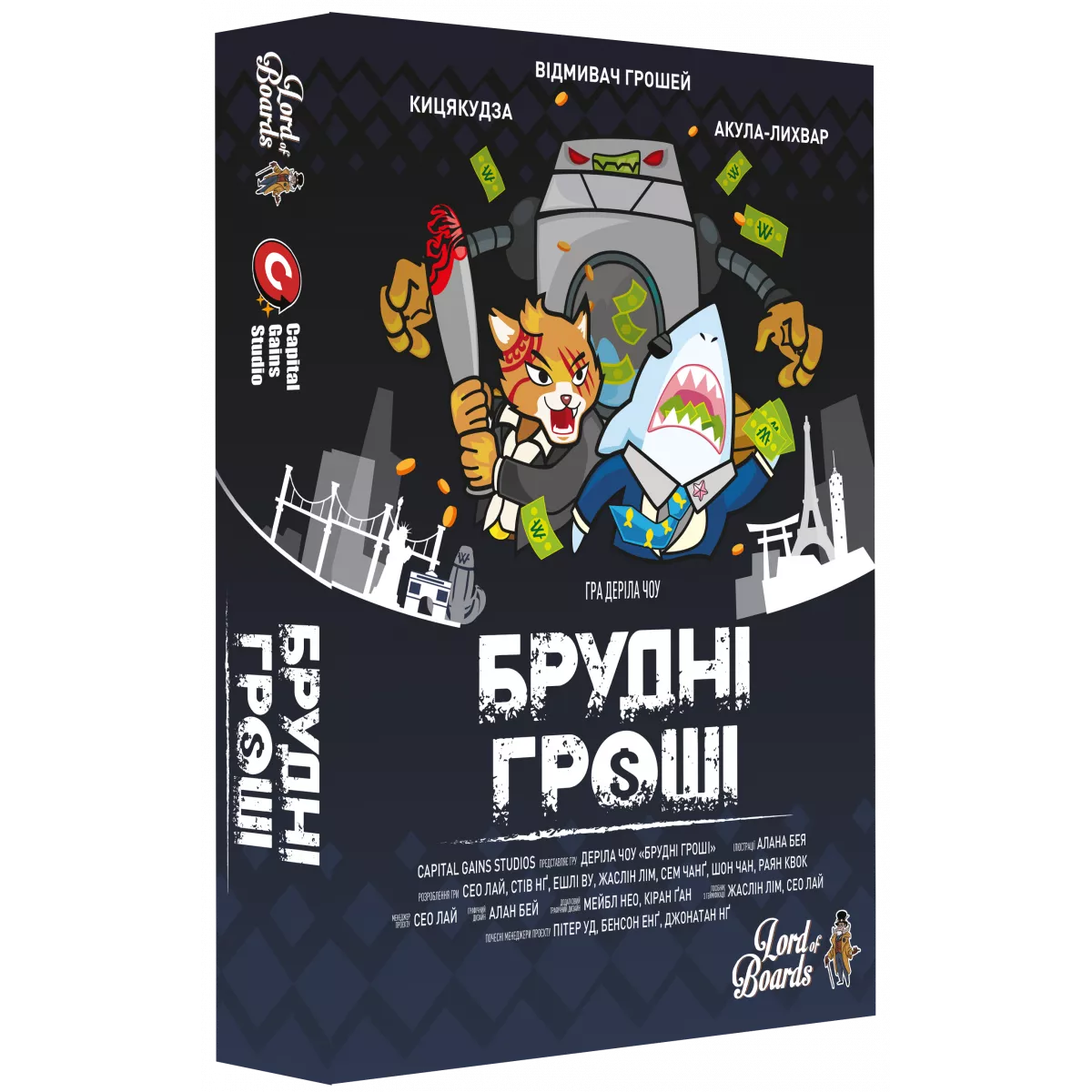 Брудні гроші (Dirty Money) – стратегічна карткова гра, в якій учасникам доведеться взяти на себе ролі злочинців, податкових шахраїв і корумпованих політиків. Головне їхнє завдання – відмивати брудні гроші, отримані незаконним шляхом. Для цього доведеться вкладати кошти в твори мистецтва, скуповувати нерухомість і йти на інші прийоми. Важливо зробити так, щоб державні органи не звертали уваги на ваші темні справи. У Брудних грошах (Dirty Money) вам не можна довіряти товаришам по грі, оскільки вони переслідують лише власні цілі. Кожен буде тільки радий викрити ваші наміри і здати вас уряду, готовому відразу підключити адвокатів і бухгалтерів. Чи вдасться вам відмити великі суми і при цьому не опинитися в чорному списку? Приготуйтеся опинитися поза законом Партія може залучати від 2 до 5 осіб. На учасників чекає кілька локацій, в яких вони можуть отримати брудні гроші. Для цього можна вирушити до США, Японії чи європейської країни. На вибір необхідно побувати в 6 місцях, де є шанс отримати непоганий, але незаконний прибуток. Після цього доведеться використовувати гроші для купівлі різних активів. На кожній карті вказано її вартість, місце для можливого розміщення, також є карти дій, які необхідно відразу розігрувати, та карти лиходіїв, які можуть виступати як помічники. Ефекти лиходія забезпечують низку можливостей, усього їх п’ять: Відмивання грошей – допомагає отримати більш бажану руку з відповідною валютою, щоб мати шанс купити більше карток розміщення. Також, це дозволяє позбавлятися від брудних грошей і забезпечує перевагу першого ходу в першому раунді. Корупційний щур – допомагає витрачати брудні гроші на купівлю речей, сприяє набору очок. Кітсукудза – кожна криптовалюта, що грається, принесе 5 доларів замість 3. Ведмеді з Уолл-стріт – дозволяють витягнути 3 карти розміщення з будь-якої з трьох колод і помістити їх над Банановою Республікою. Лихвар – дозволяє витратити будь-яку грошову картку як грошову картку на 2 долари в будь-якій валюті. Гра триває кілька раундів, доки не буде виконана умова для завершення партії. Під час кожного ходу гравці можуть здійснити ряд дій. Наприклад, під час переходу на локацію потрібно забрати там усі карти грошей. Якщо там є карти дій, необхідно відразу їх розіграти в будь-якому порядку, а потім відправити зіграну карту в стопку скиду. На руках у гравця може бути не більше 7 грошових карток, інакше є ризик привернути небажану увагу влади. Зайві карти доведеться надіслати у трекер очок Чорного списку. Після того, як ви зібрали карти грошей і розіграли карти дій, за бажанням можна зіграти карту «Розташування». Використовувати ефекти на куплених картах розміщення можна щоразу, коли є відповідність їх критеріям Раунд закінчується, коли всі гравці зробили свій хід. Час обирати найдосвідченішого шахрая Останній раунд починається, коли у будь-якого гравця набралося 10 або більше карток розміщення. Після того, як раунд дограно, необхідно виконати підрахунок очок. У кожного гравця знімається 1 очко за кожне очко чорного списку. Виняток передбачений для того, хто набрав найменше очок чорного списку. Той, хто має найбільший чорний список, втрачає додатково ще 2 очки. Різні карти з ефектами розраховуються по-різному залежно від умов. Наприклад, враховується кількість зібраних витворів мистецтва. За 1 роботу нар