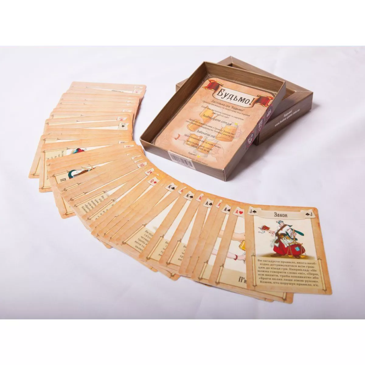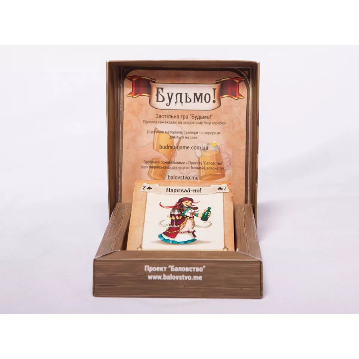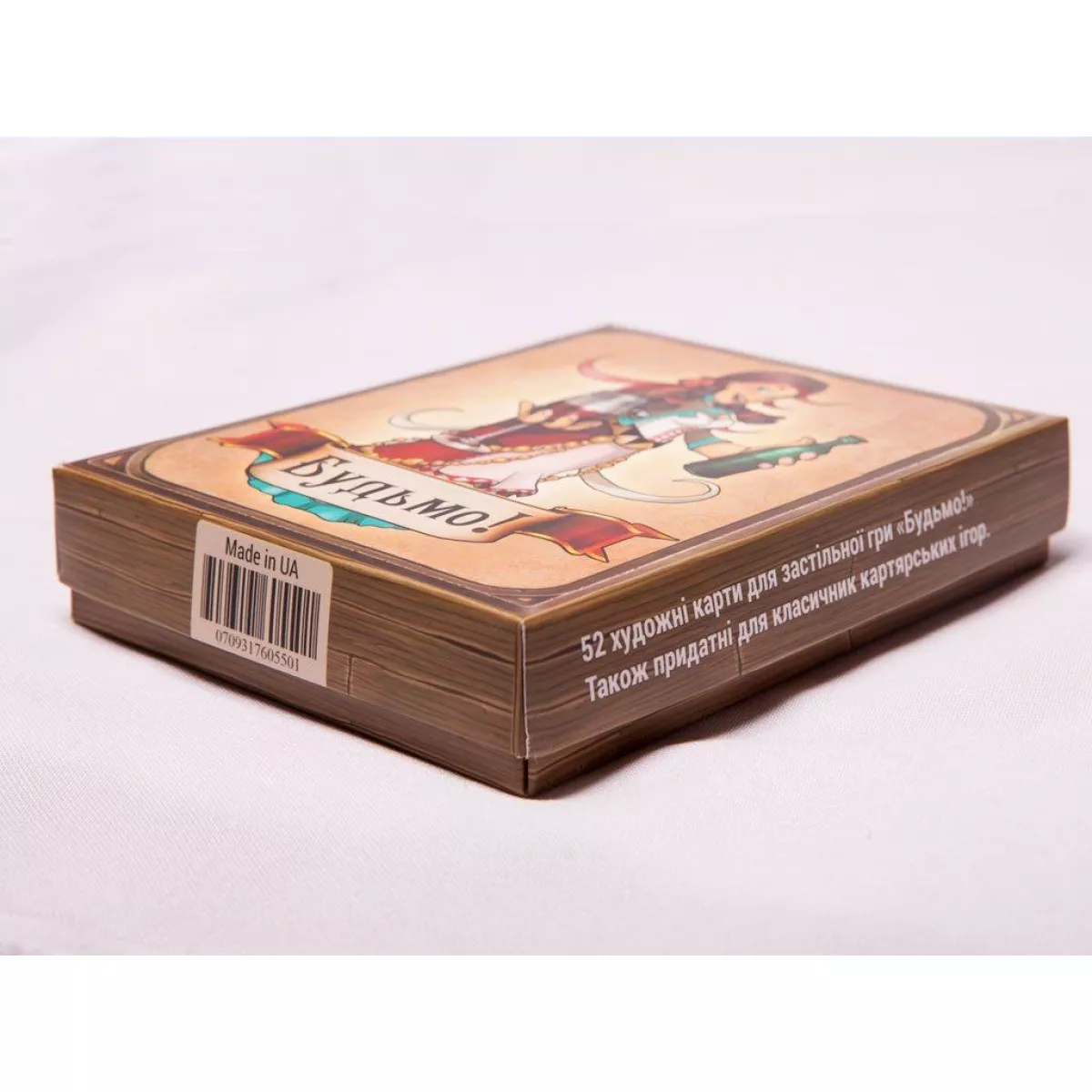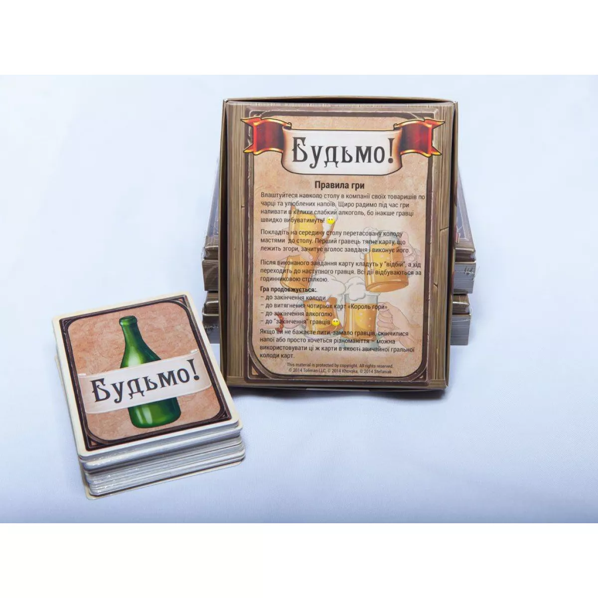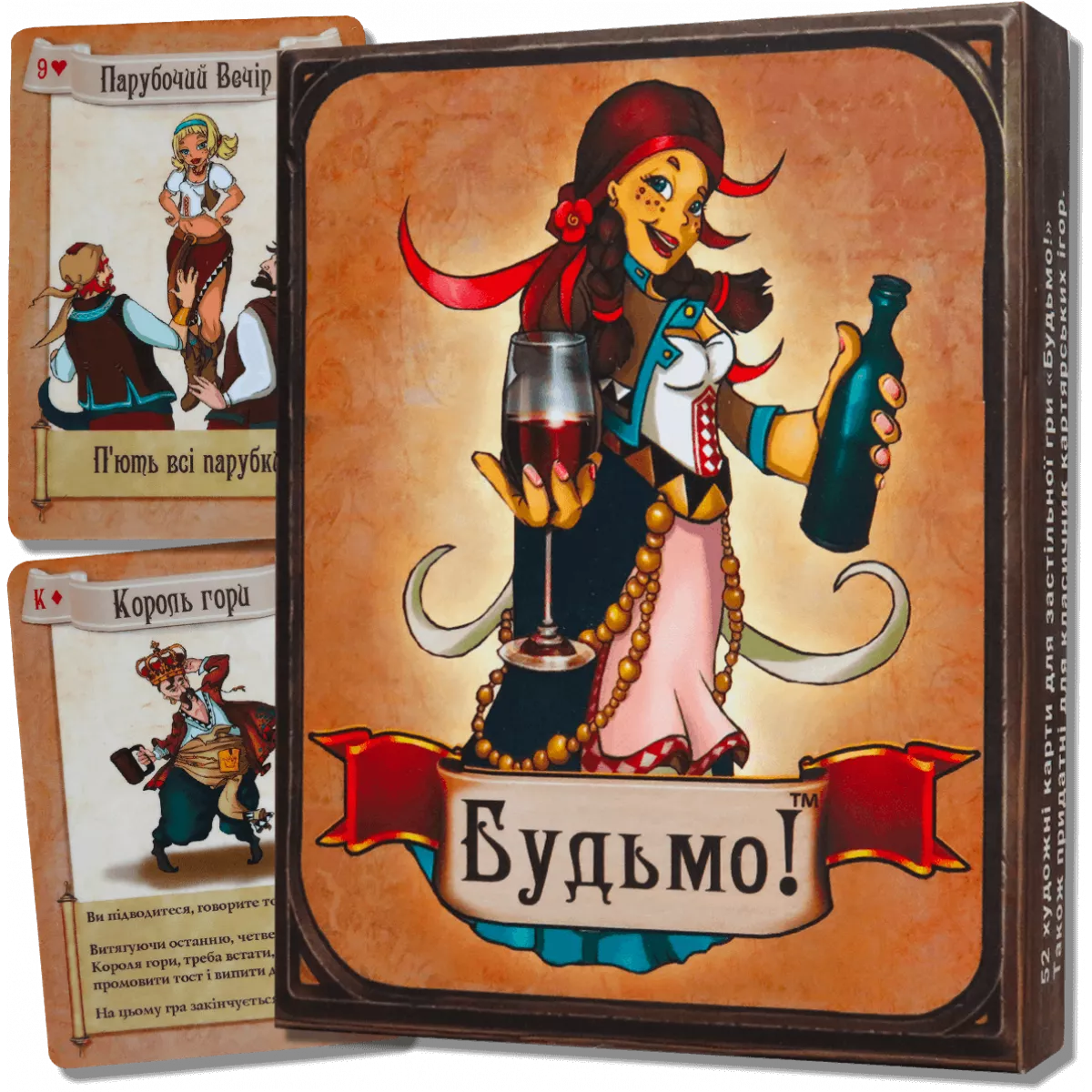 Гра "Будьмо!" — це настільна гра і невичерпне джерело розваг для дорослих, які цінують гумор і веселощі. Гра складається з 52 карт, кожна з яких прикрашена автентичним авторським малюнком. Карти оформлені в українському стилі, що робить гру ще більш привабливою.