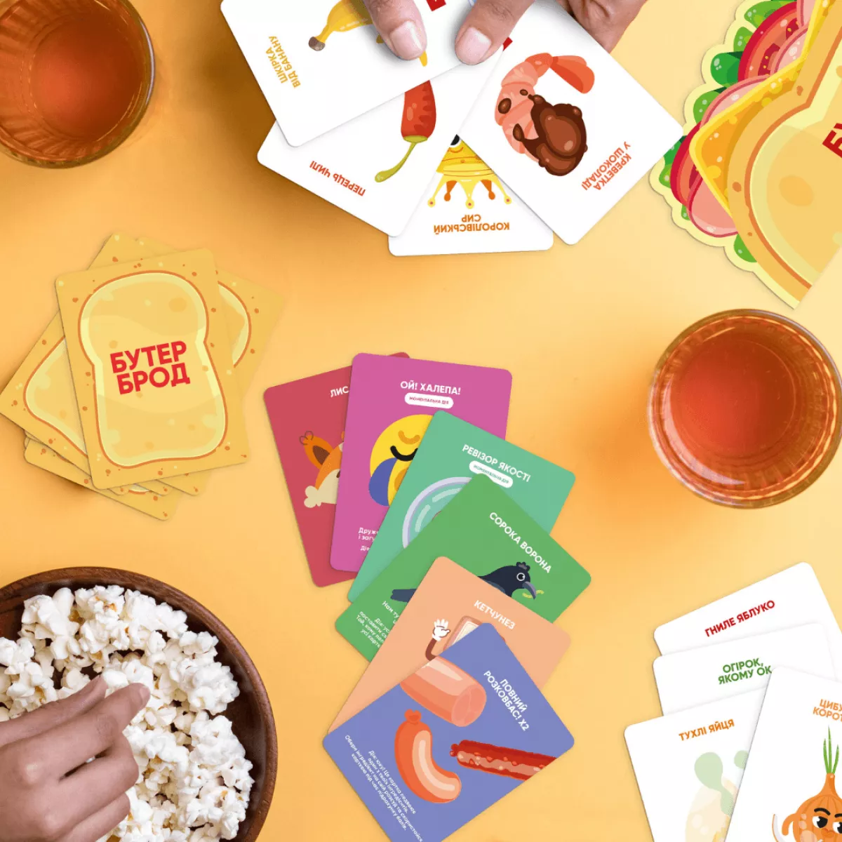 Бутерброд — це чудовий вибір для дружніх вечорів, сімейних зустрічей чи виїздів на природу. Ця весела гра захопить усіх, від дітей до дорослих: просто вибирайте інгредієнти, збирайте свій «бутерброд» і намагайтеся набрати максимум балів. Все максимально просто — роздали картки, і вперед!