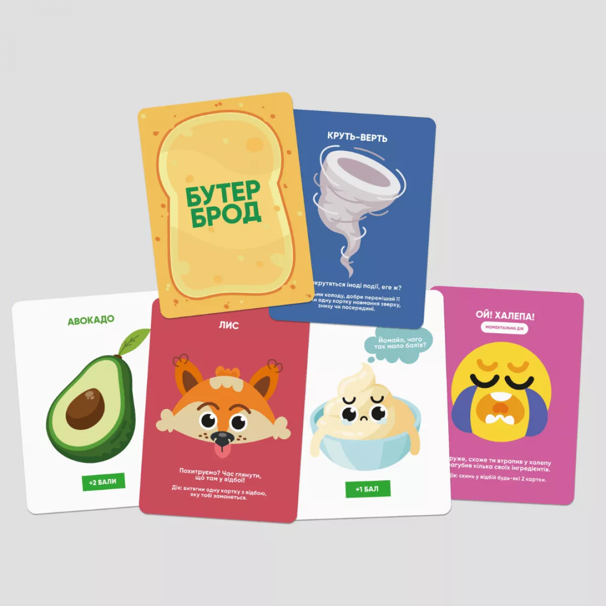 Всередині гри на Вас чекає безліч карток-інгредієнтів та веселі картки-дії з завданнями для гравців. Кожен інгредієнт додає або віднімає бали Вашому бутерброду, а картки-дії додать перчинки та запалу Вашій грі!