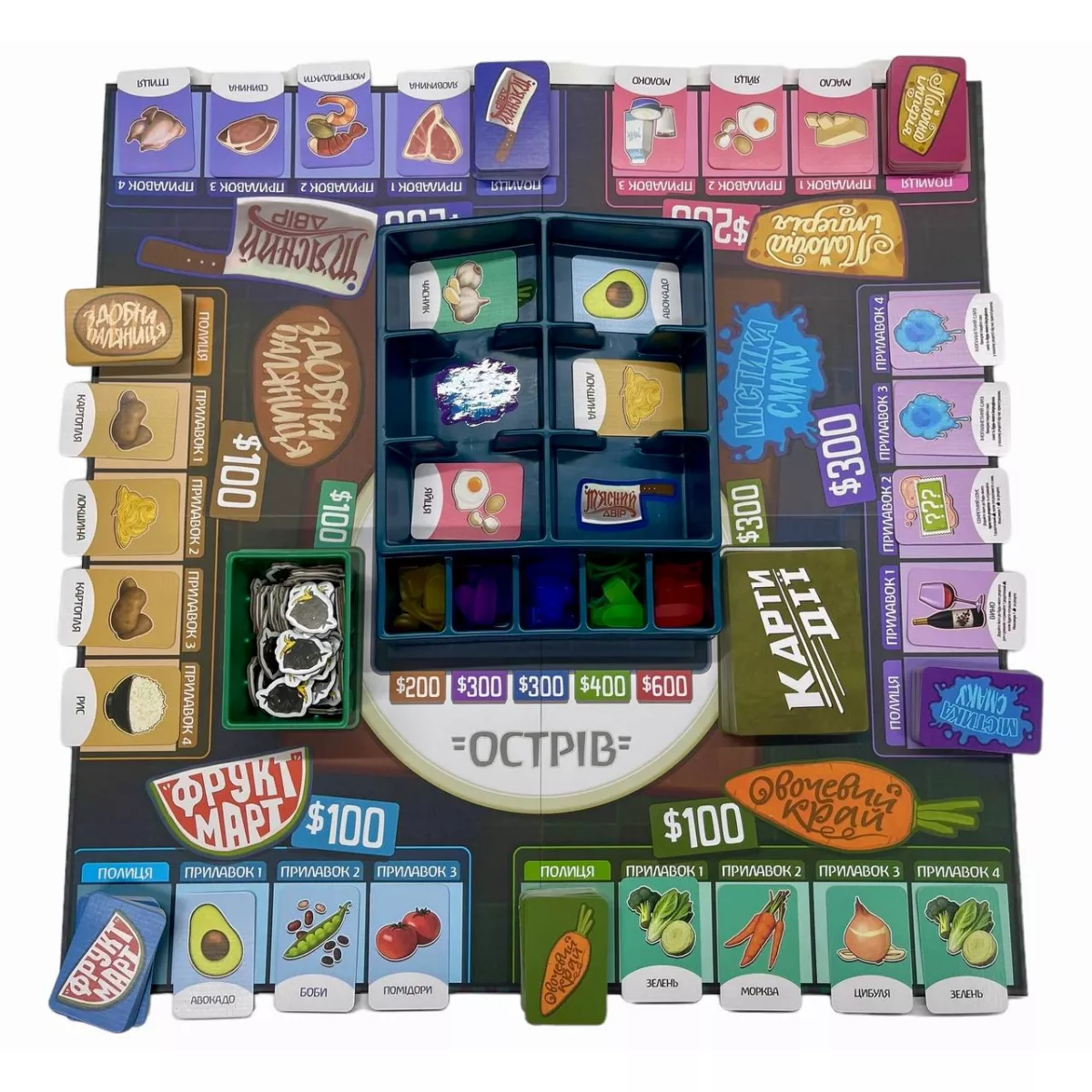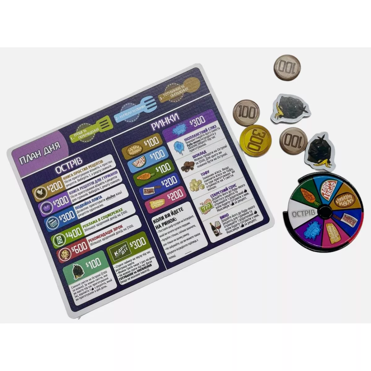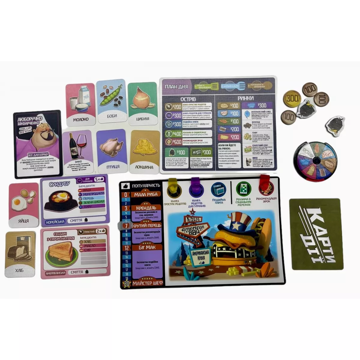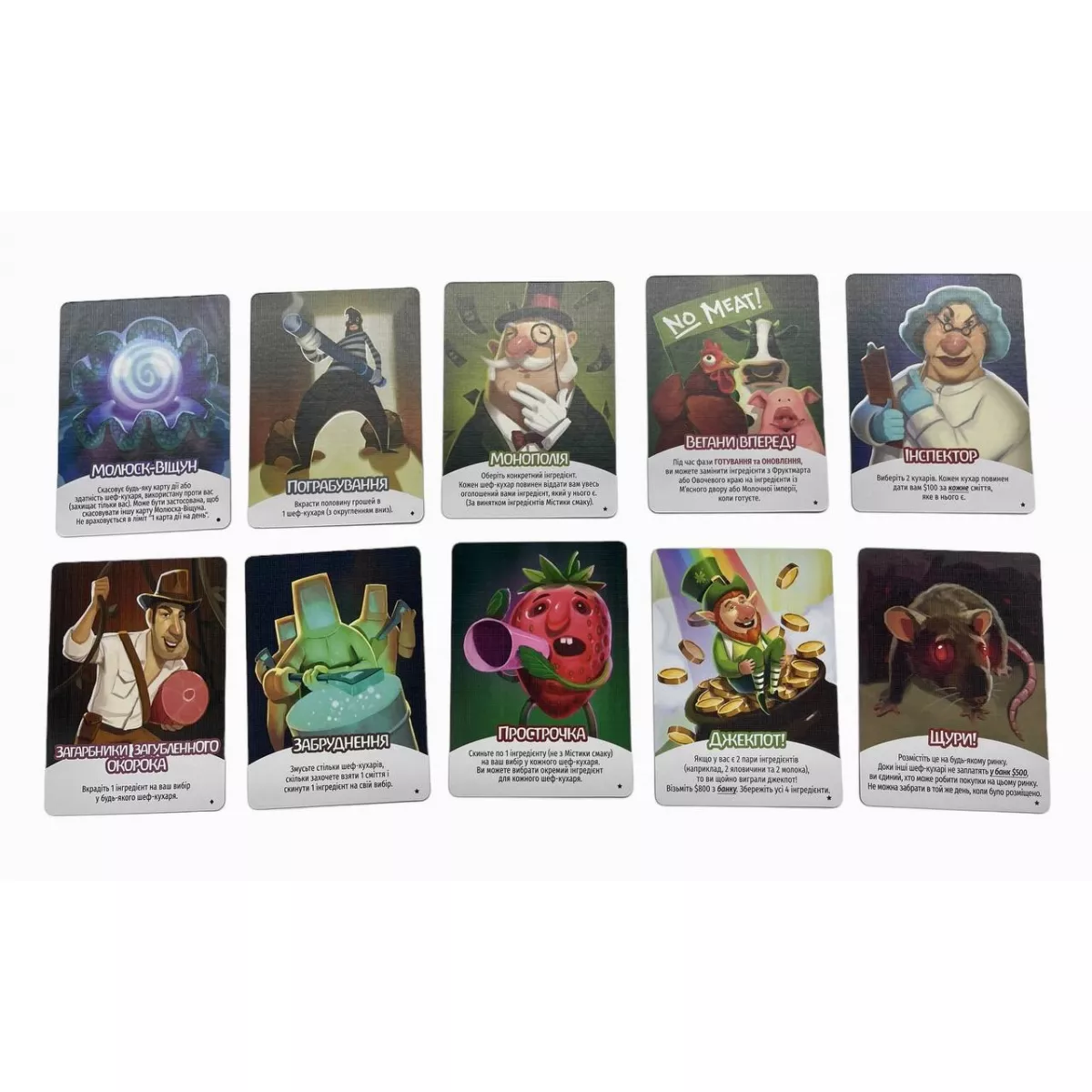 купуйте карти з прилавків і полиць, а також обмінюйтесь інгредієнтами, рецептами, картами дій, поліпшеннями, послугами чи сміттям з іншими кухарями,