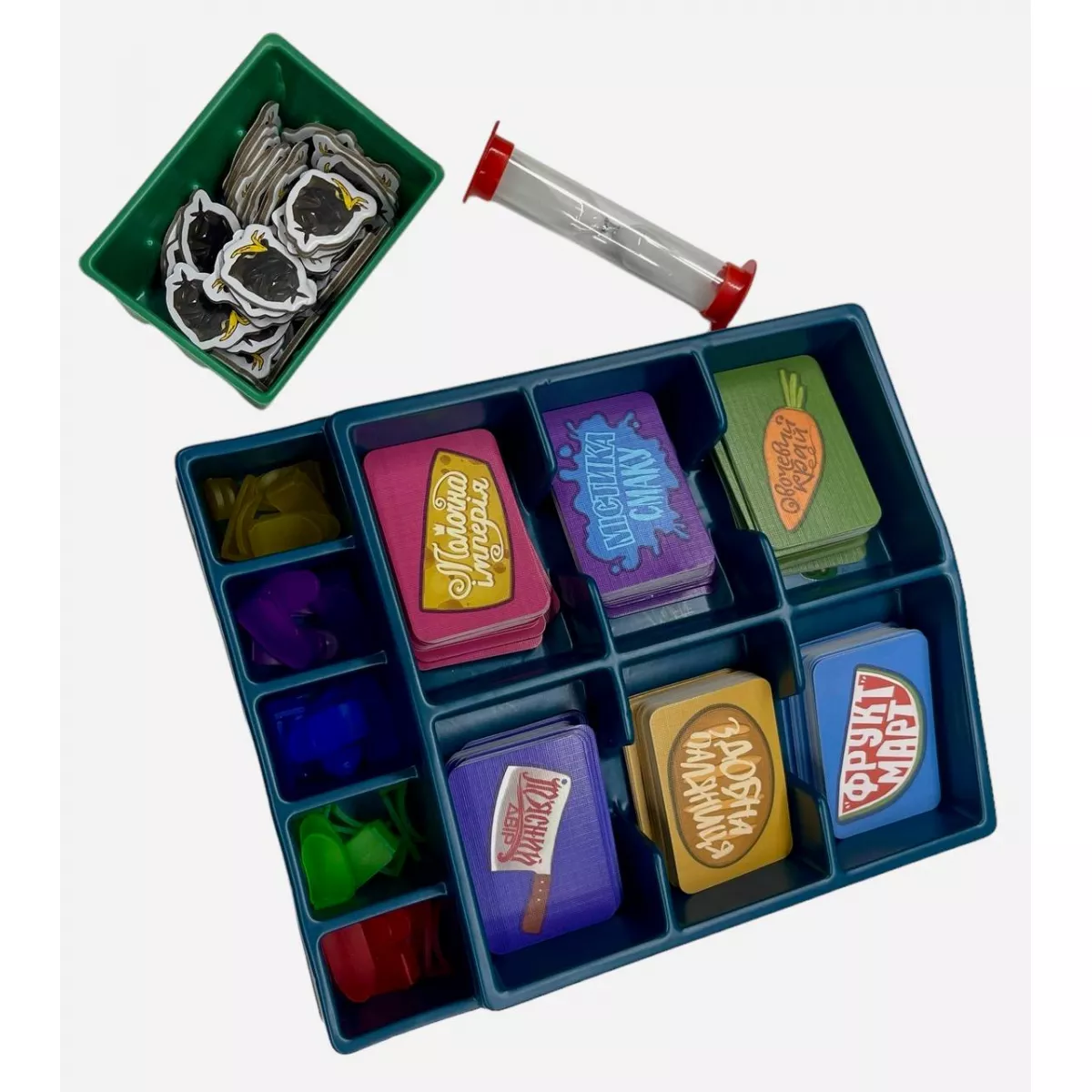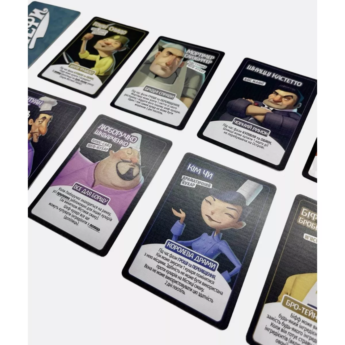 У коробці 1 Ігрове поле, 1 трей для скиду, 8 ресторанів, 12 карт шеф-кухаря, 12 фігурок шеф-кухаря з підставками, 24 картки базових рецептів, 24 картки рецептів для гурманів, 174 карт інгредієнтів, 36 карт дій, 6 пам'яток, 6 коліс переміщення, 6 індикаторів популярності, 30 кліпс, 96 жетонів монет, 44 жетони сміття, 1 Конетйнер для сміття, 1 Таймер, 1 Правила, 1 Посібник зі швидкого старту