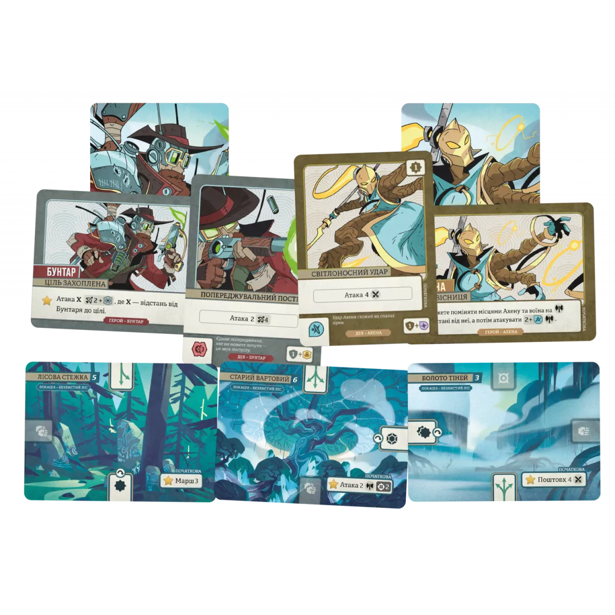 У коробці Поле битви в Безлистому лісі (6 карт локацій), Набір карт Ахени (1 герой, 1 карта здоров'я, 4 карти дій), Набір карт Бунтаря (1 герой, 1 карта здоров'я, 1 помічник, 3 карти дій), 2 карти для соло-гри (потрібне доповнення «Імператор»)
